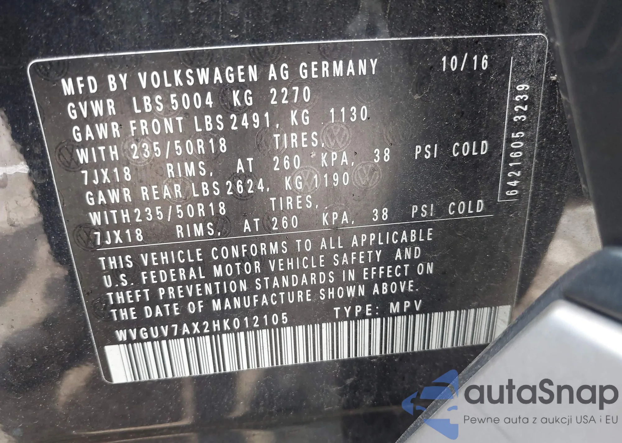 • VIN WVGUV7AX2HK012105