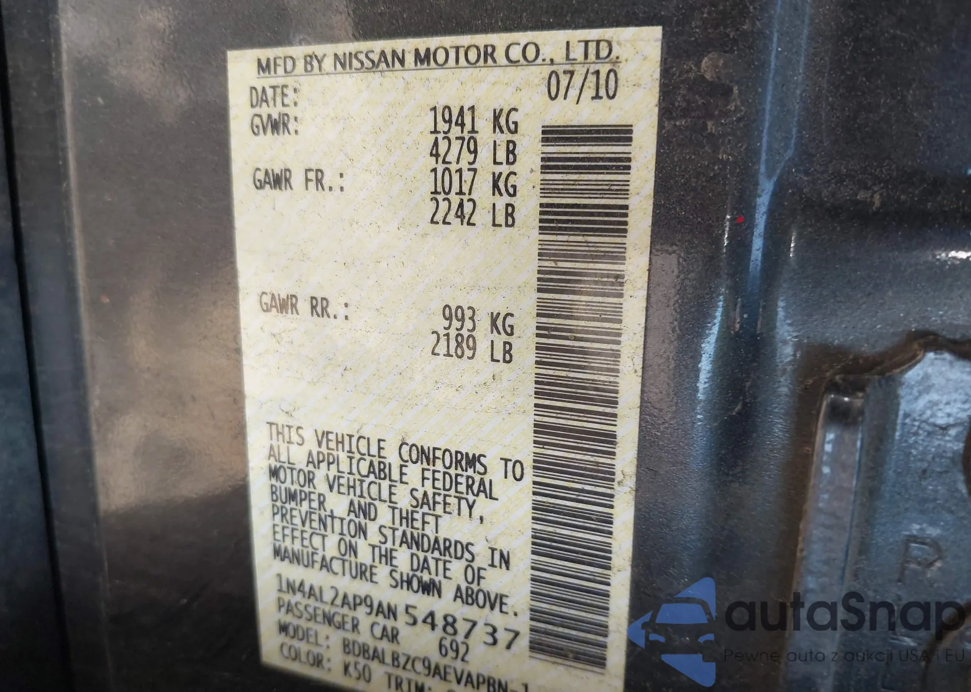 • VIN 1N4AL2AP9AN548737