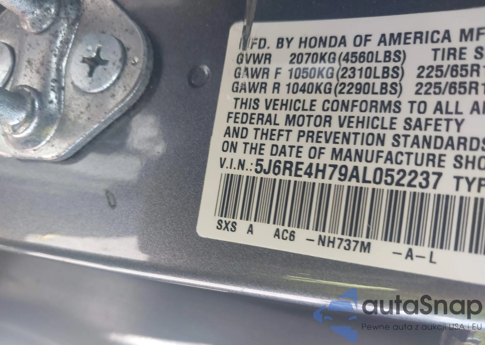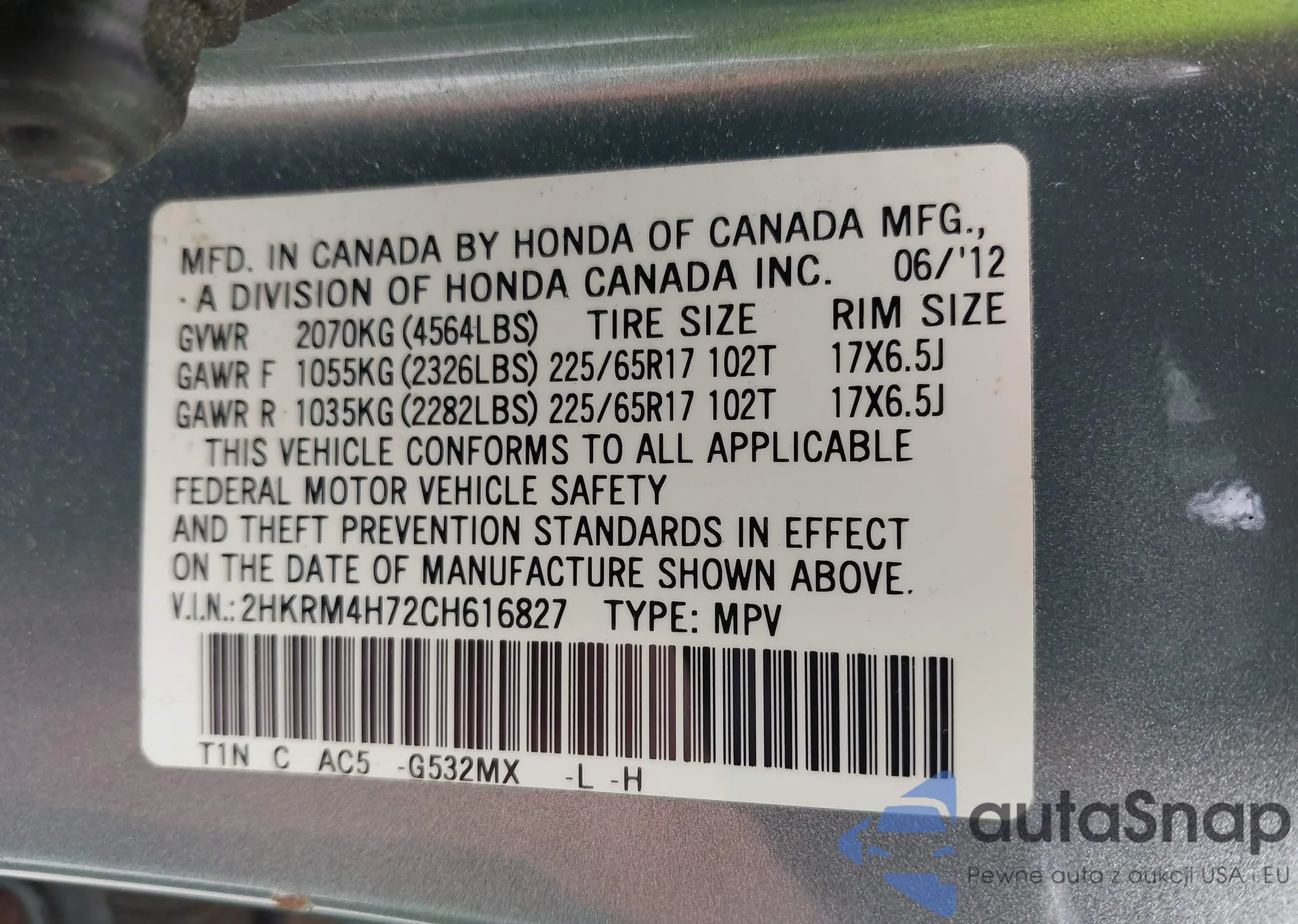 • VIN 2HKRM4H72CH616827