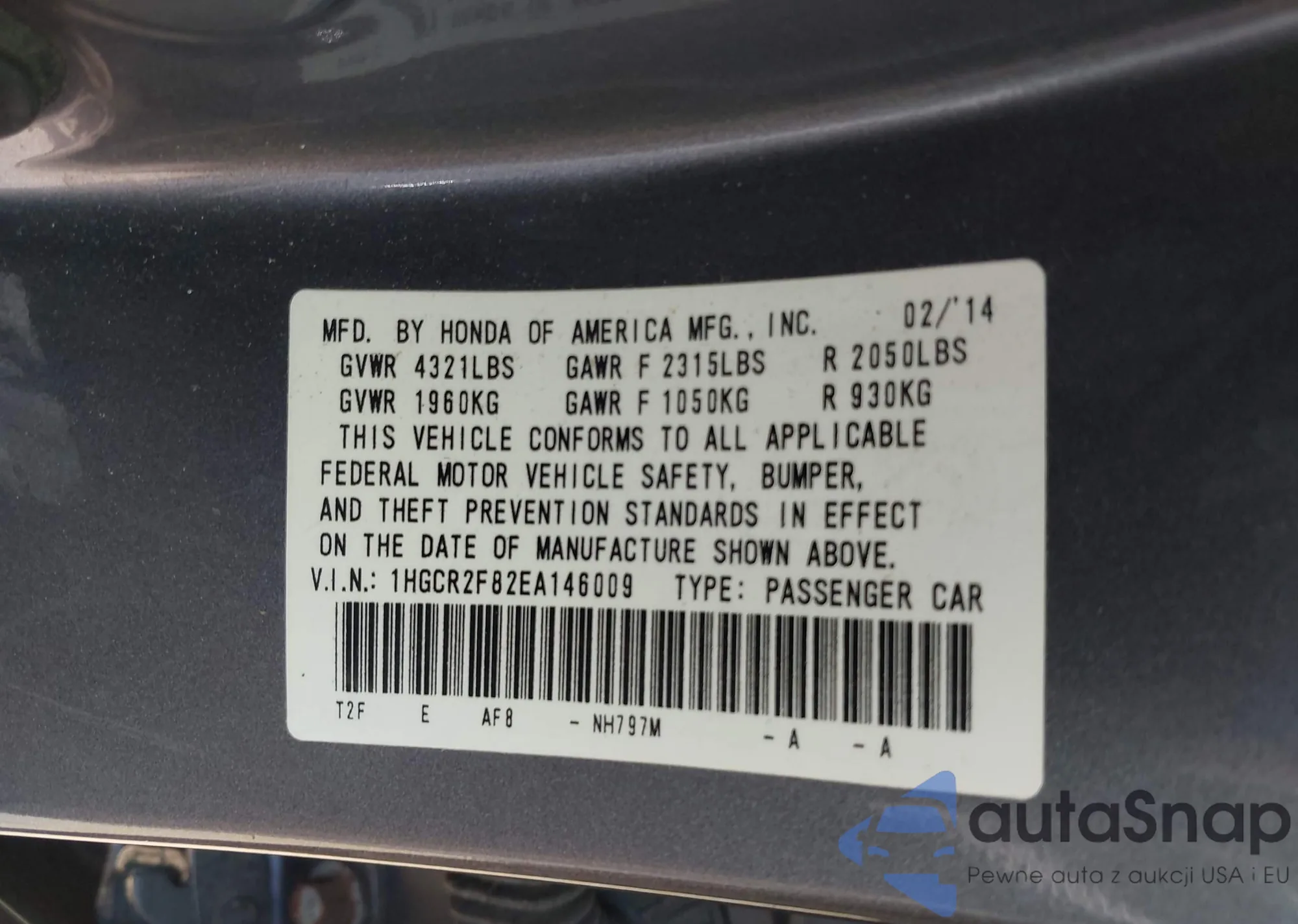 LOT: 42150812 VIN: 1HGCR2F82EA146009