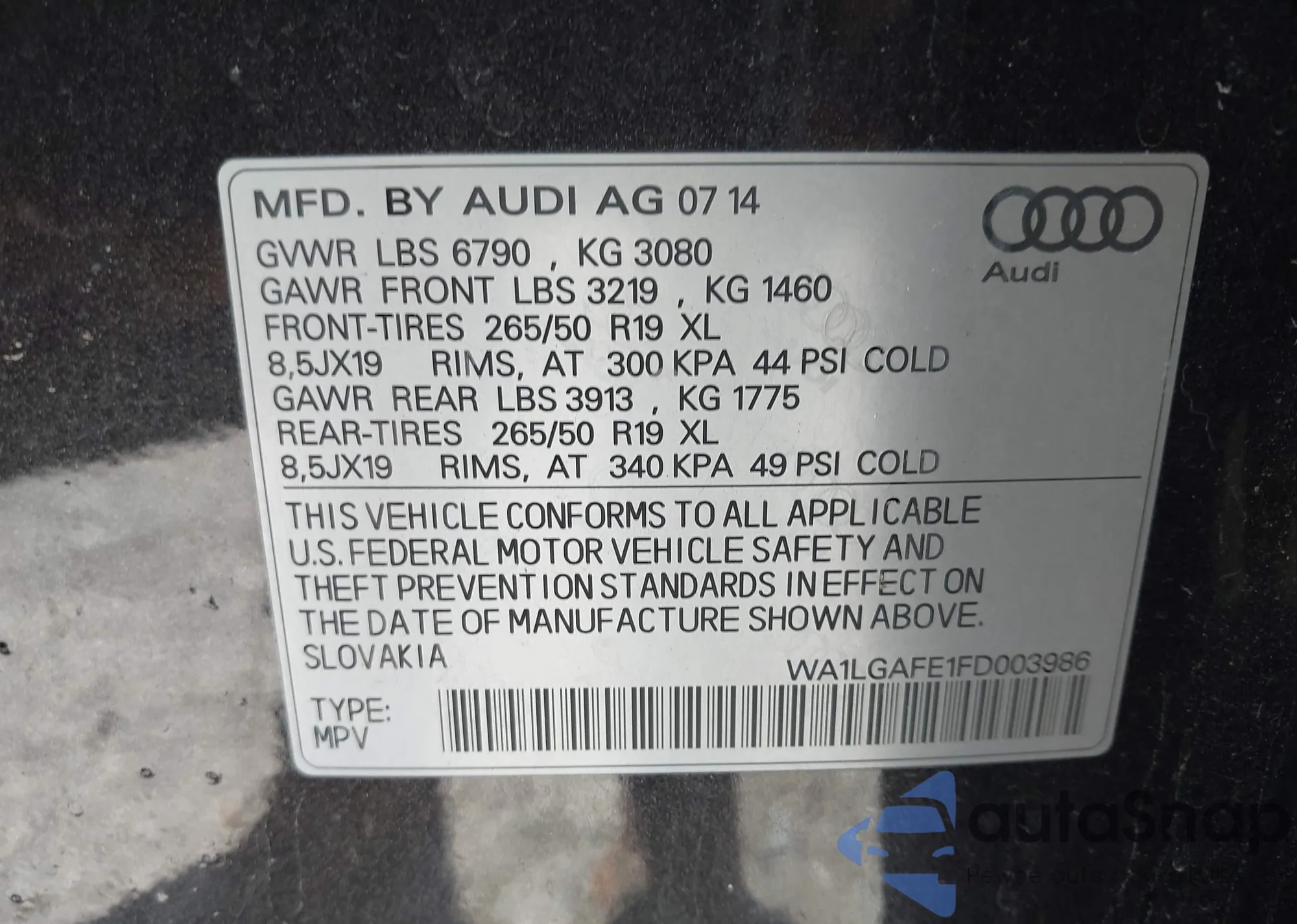LOT: 41849204 VIN: WA1LGAFE1FD003986