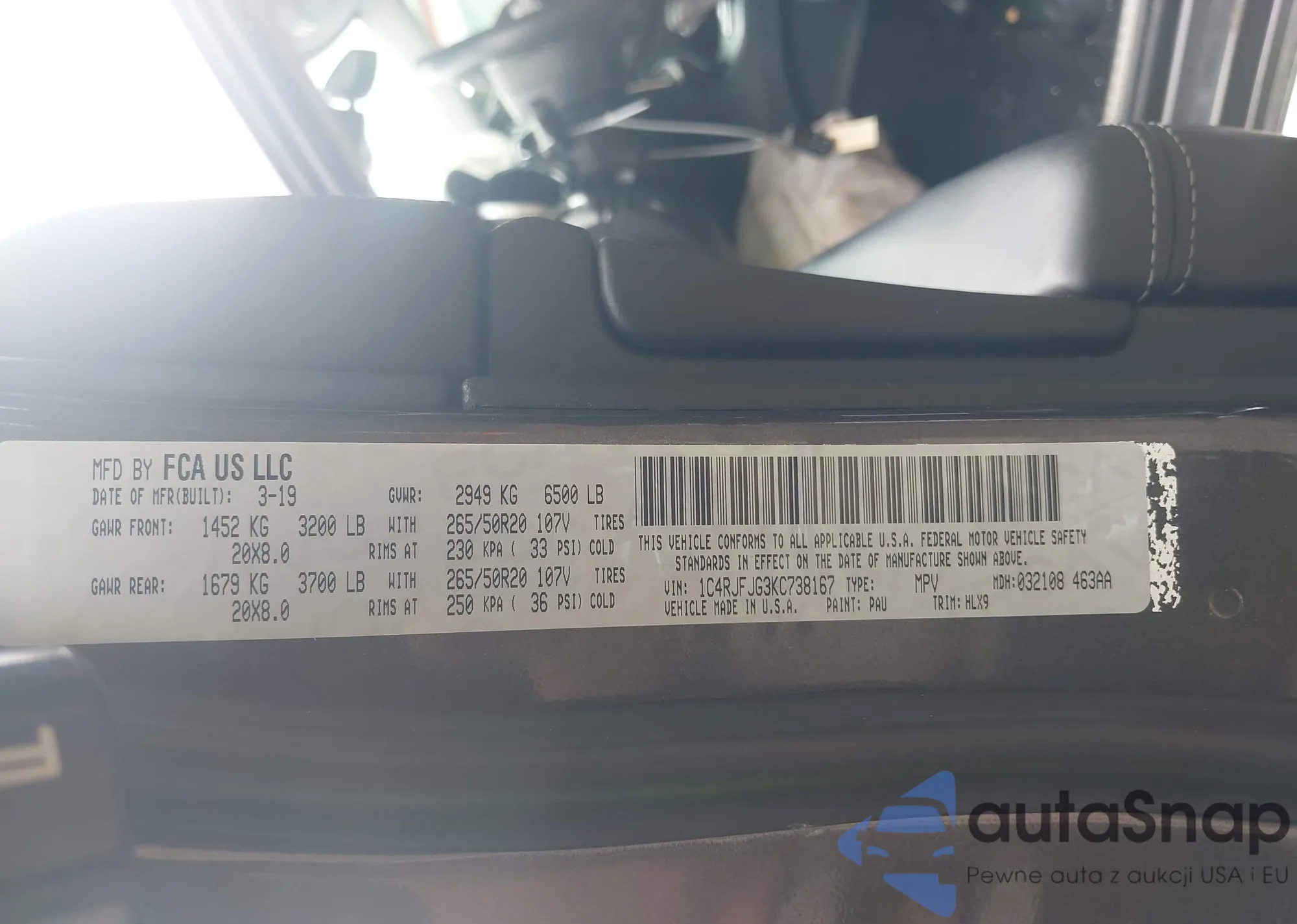 • VIN 1C4RJFJG3KC738167