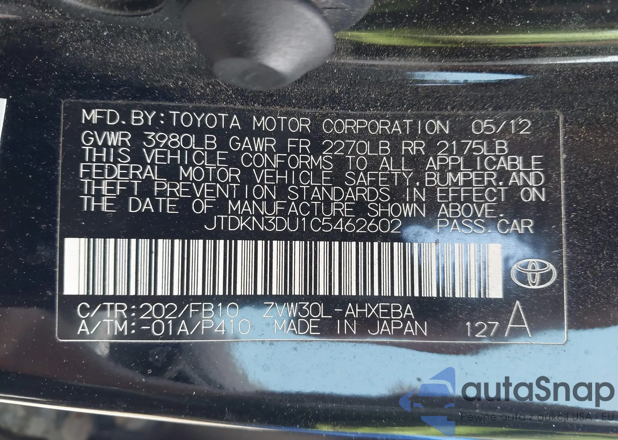 LOT: 42996477 VIN: JTDKN3DU1C5462602
