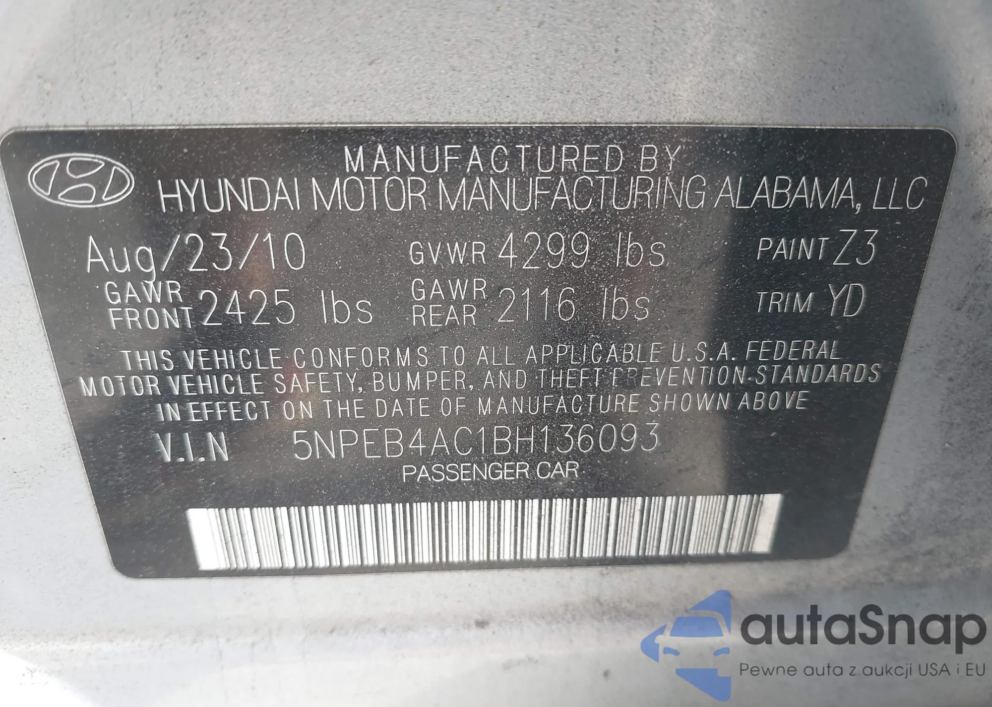 • VIN 5NPEB4AC1BH136093