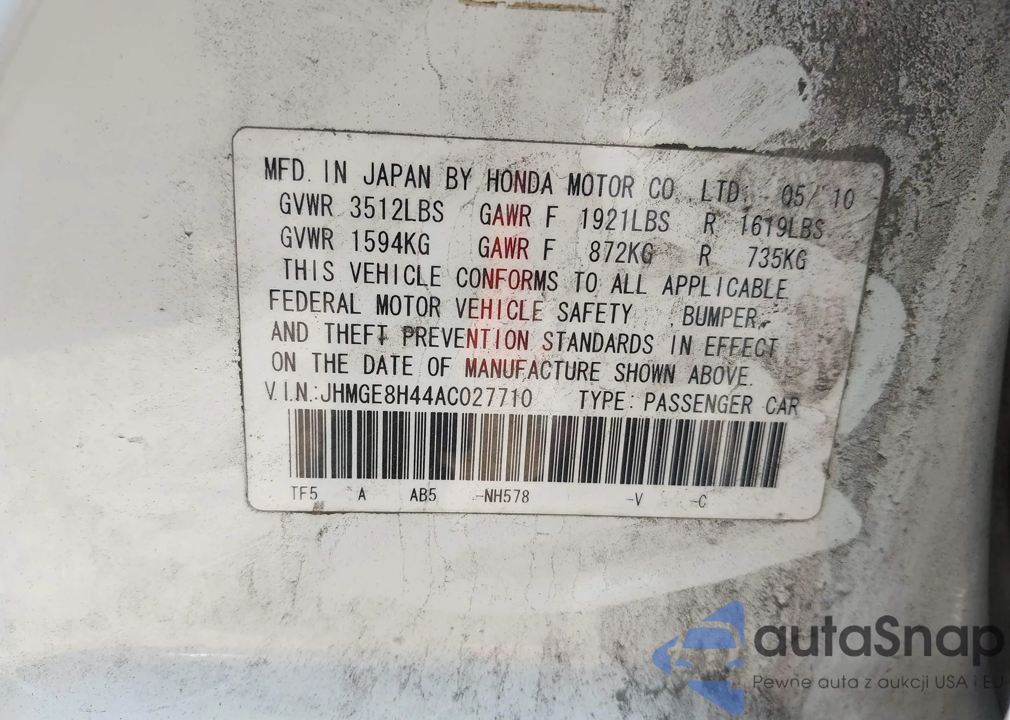 • VIN JHMGE8H44AC027710