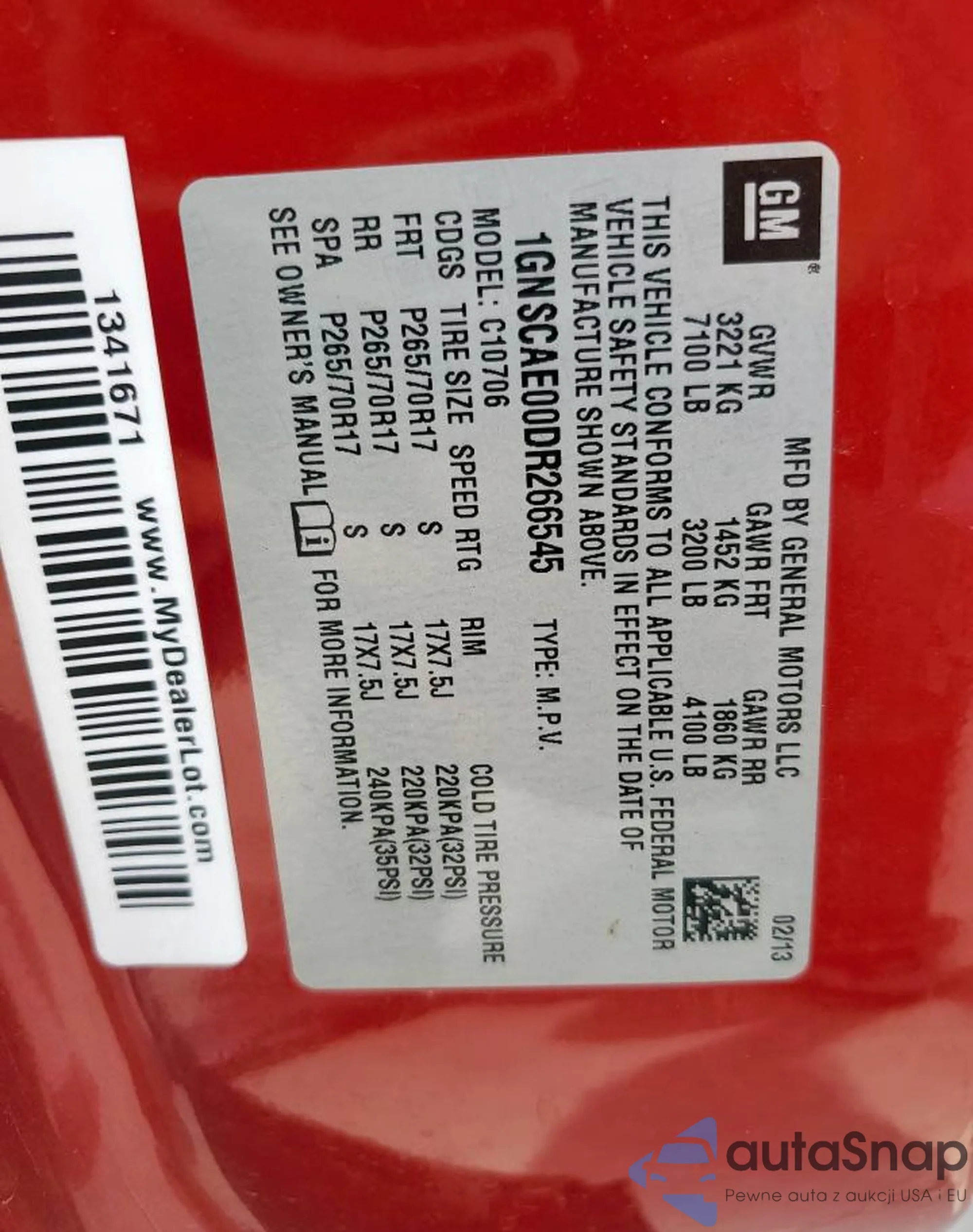 LOT: 68754495 VIN: 1GNSCAE00DR266545