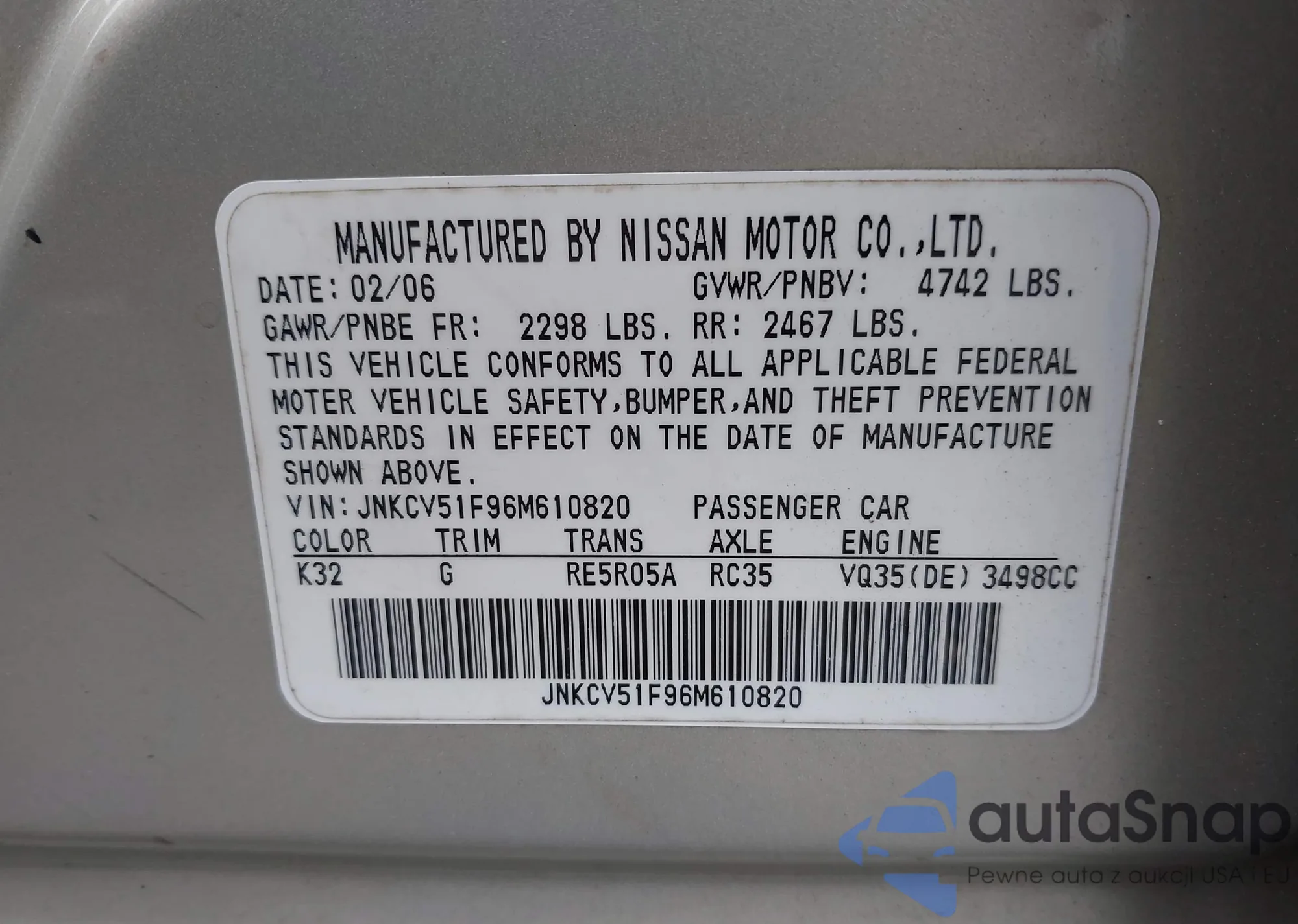 LOT: 42326779 VIN: JNKCV51F96M610820