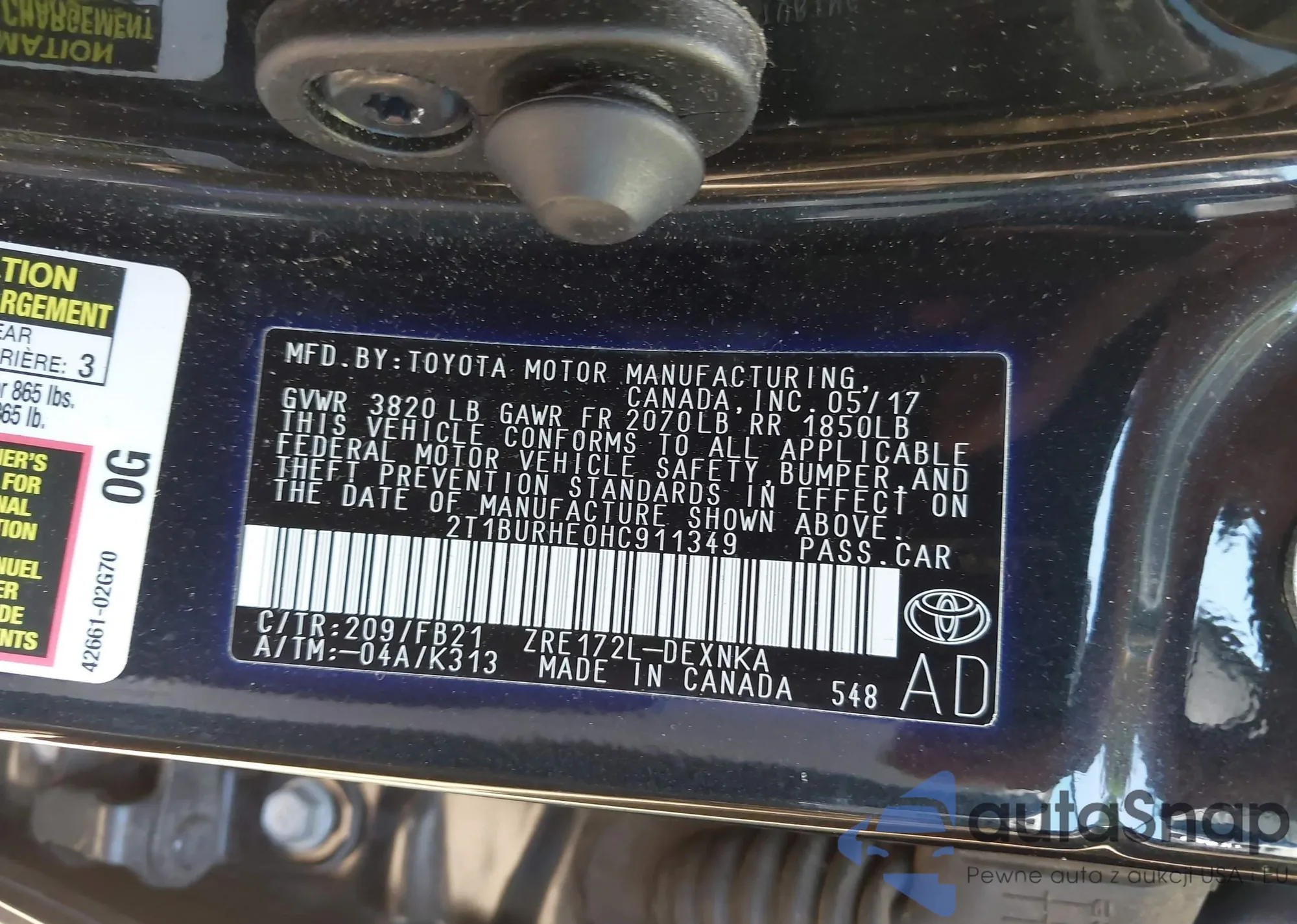 LOT: 42798891 VIN: 2T1BURHE0HC911349