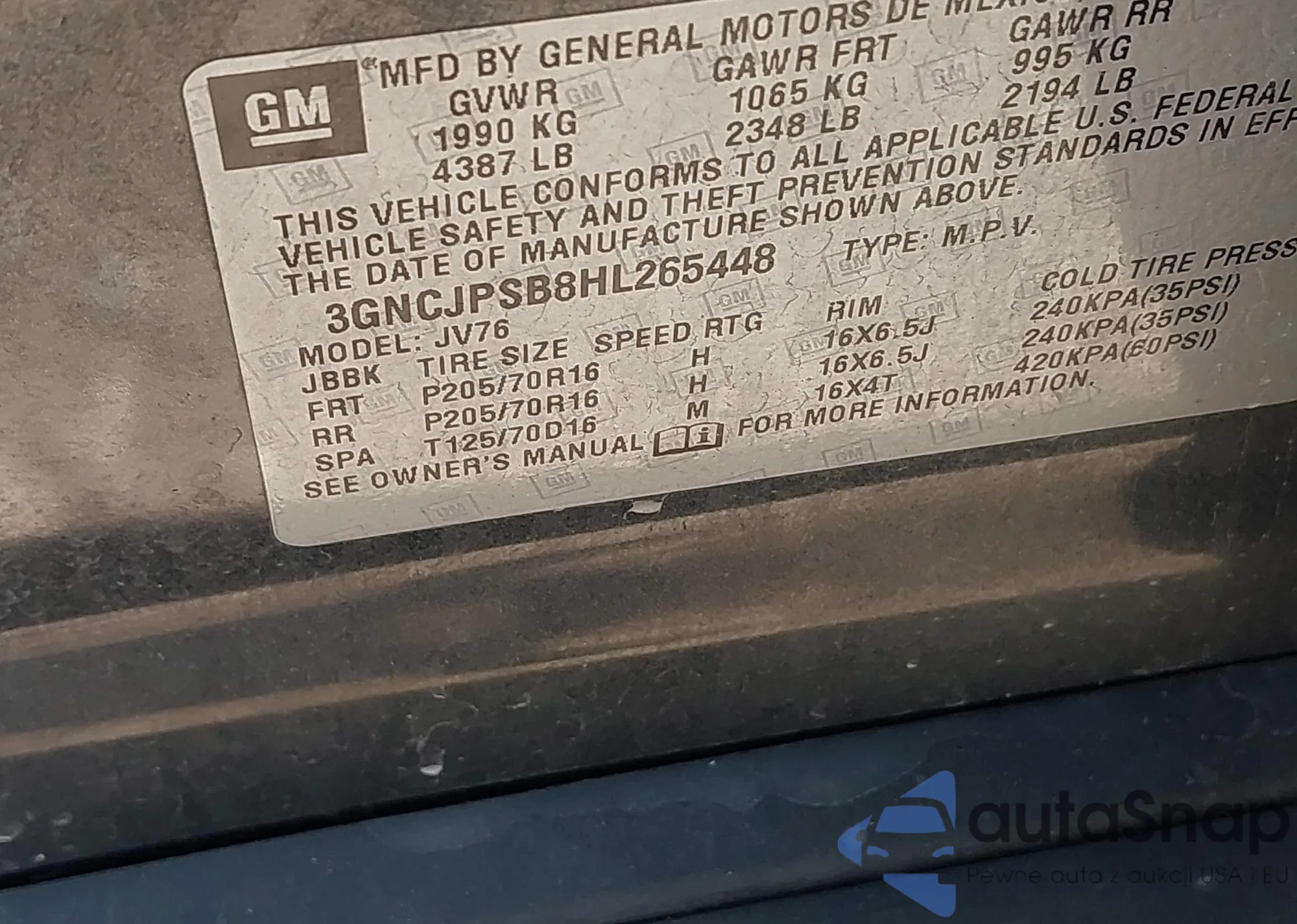 • VIN 3GNCJPSB8HL265448