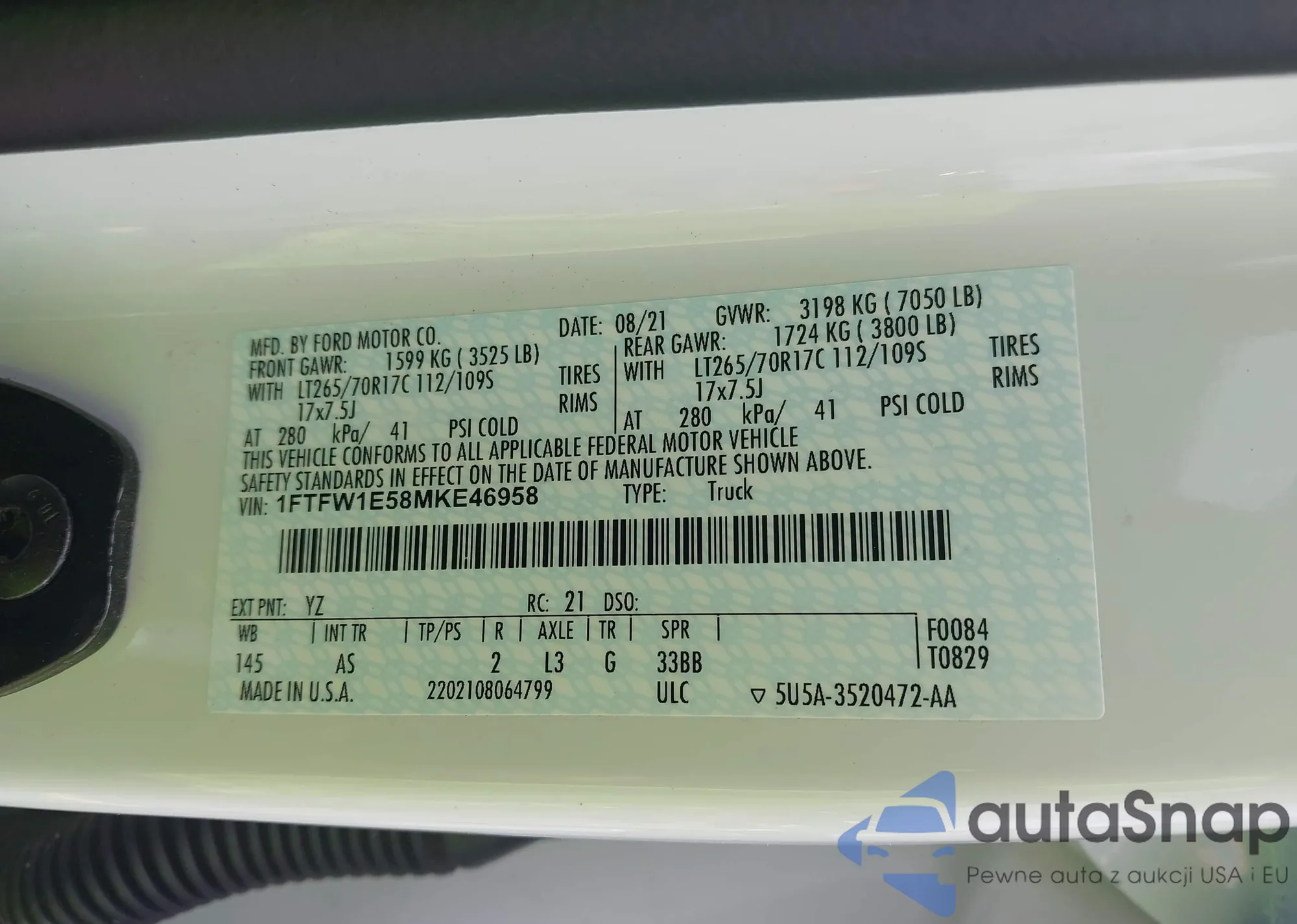 LOT: 42497476 VIN: 1FTFW1E58MKE46958