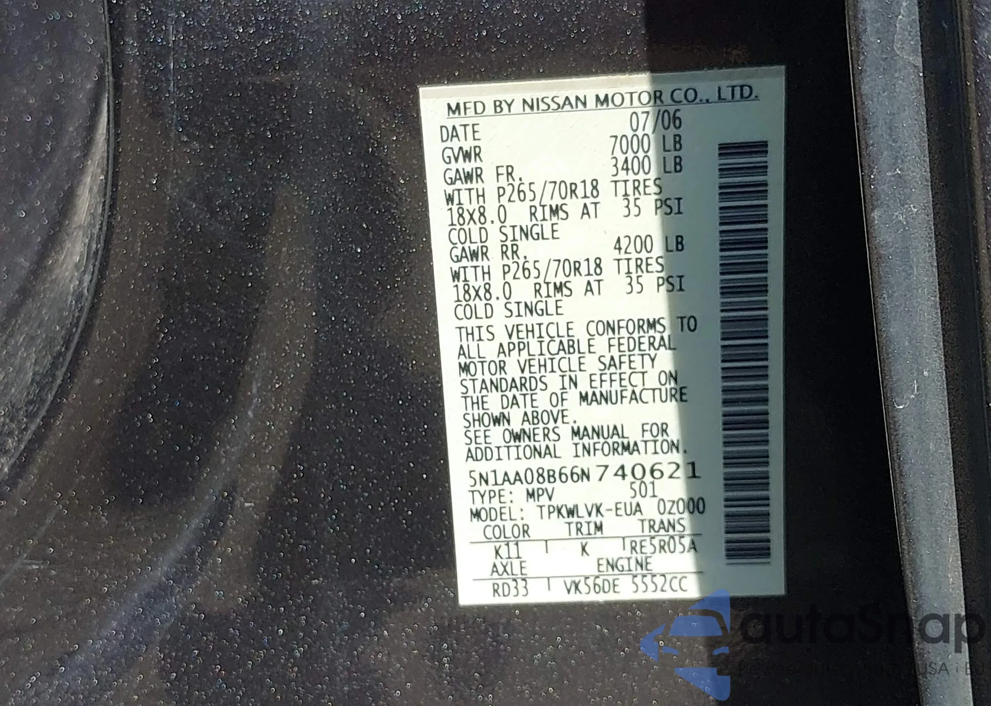 • VIN 5N1AA08B66N740621