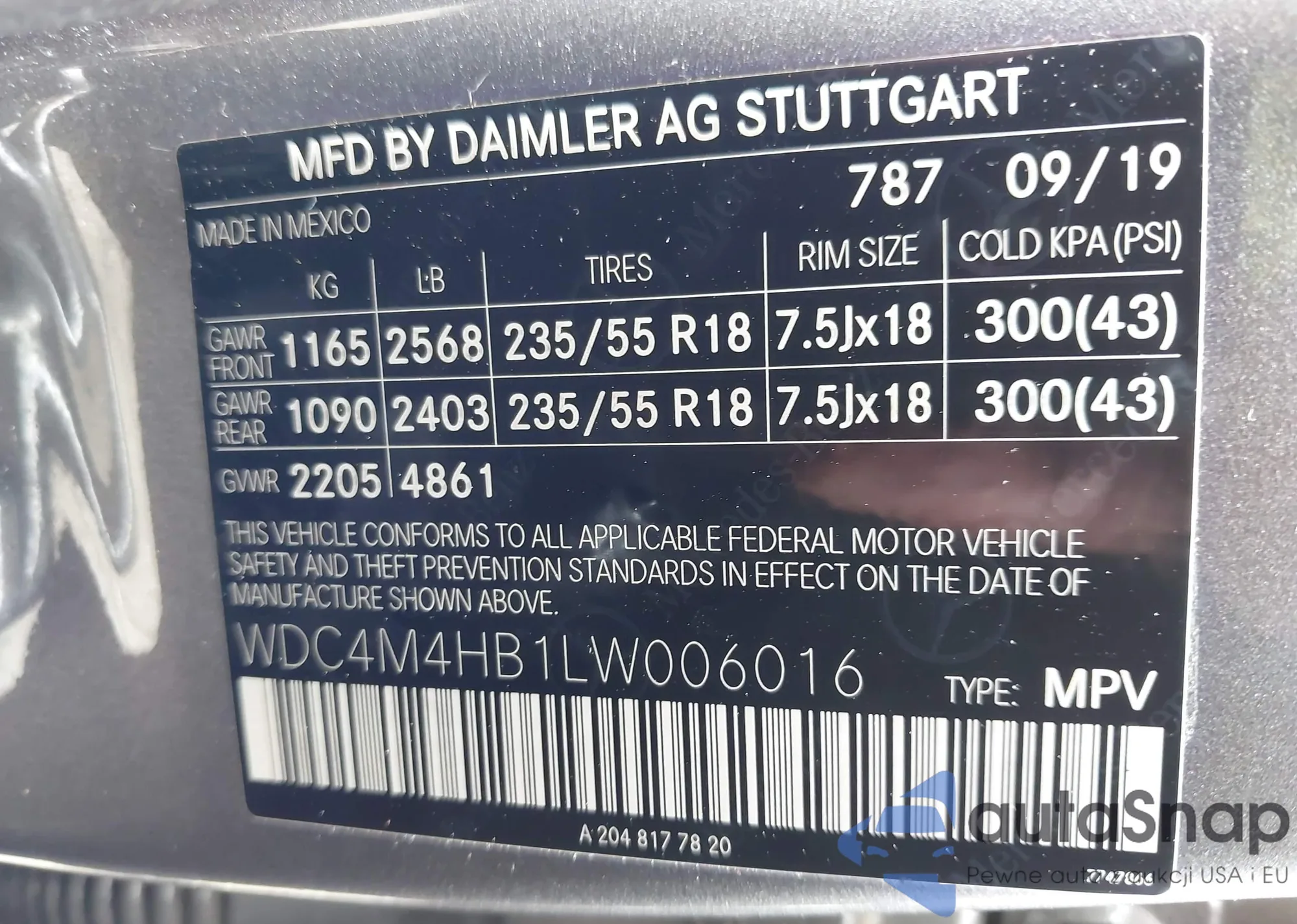 LOT: 42332649 VIN: WDC4M4HB1LW006016