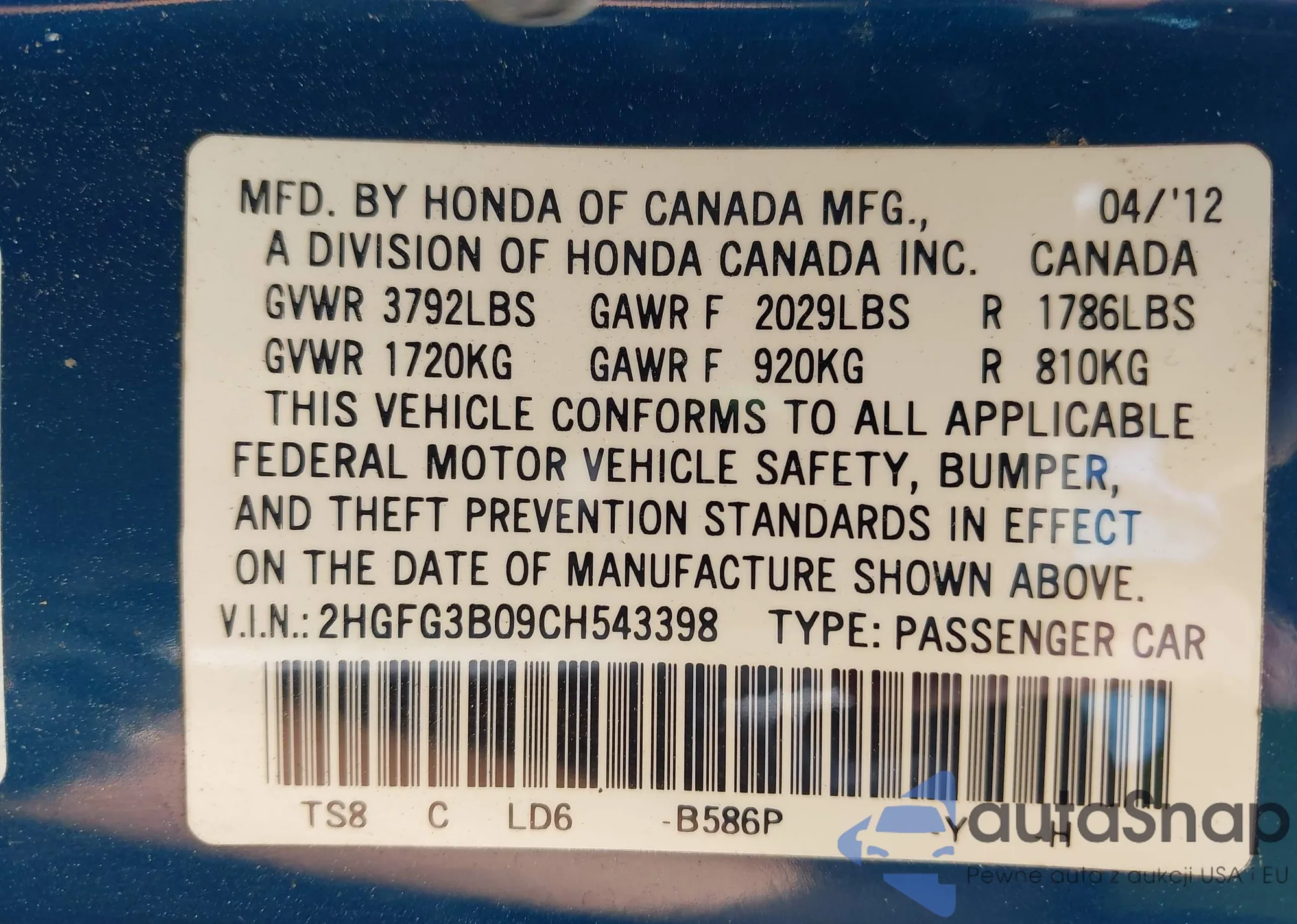 • VIN 2HGFG3B09CH543398
