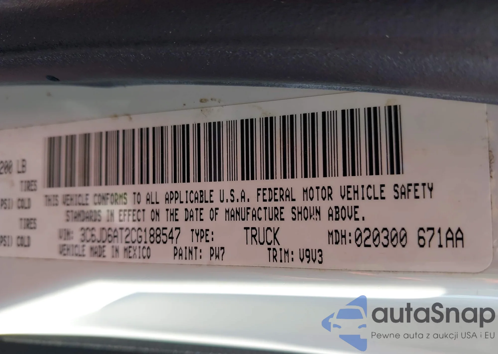 • VIN 3C6JD6AT2CG188547