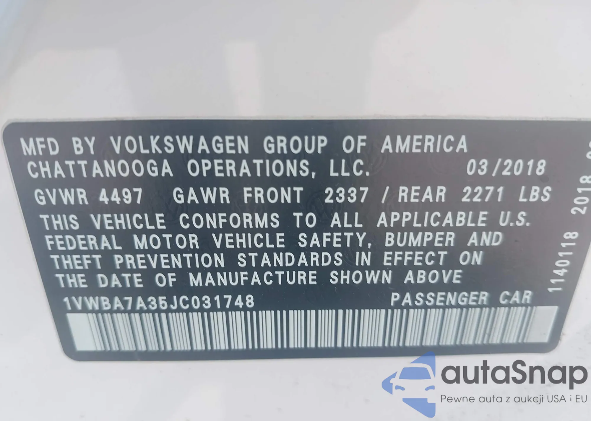 LOT: 42731713 VIN: 1VWBA7A35JC031748