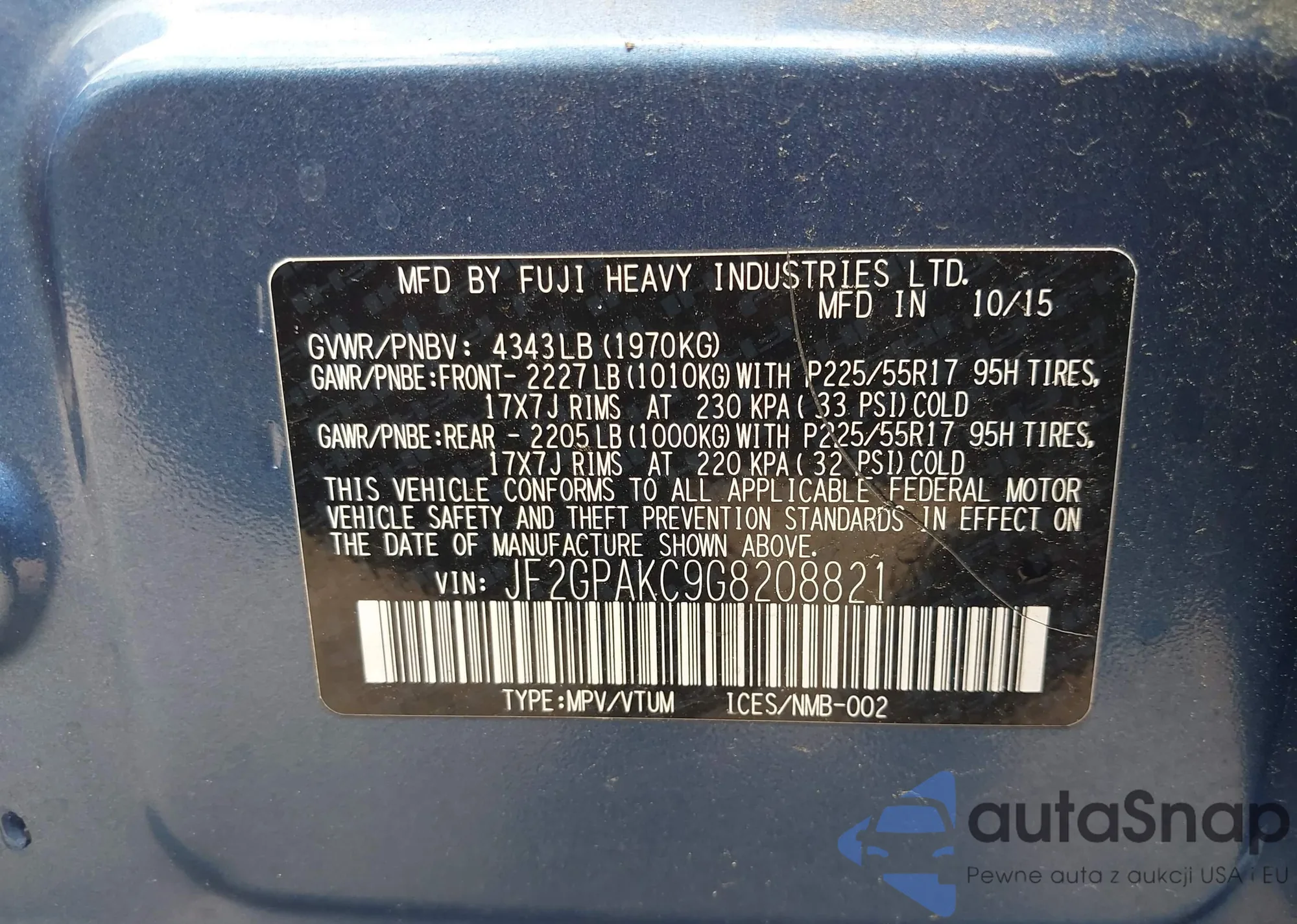 LOT: 42463927 VIN: JF2GPAKC9G8208821