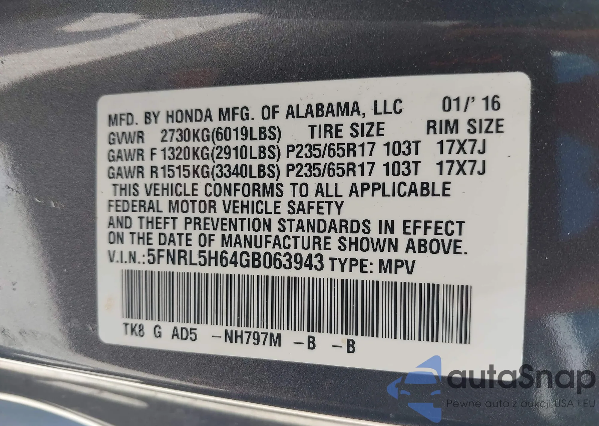 • VIN 5FNRL5H64GB063943