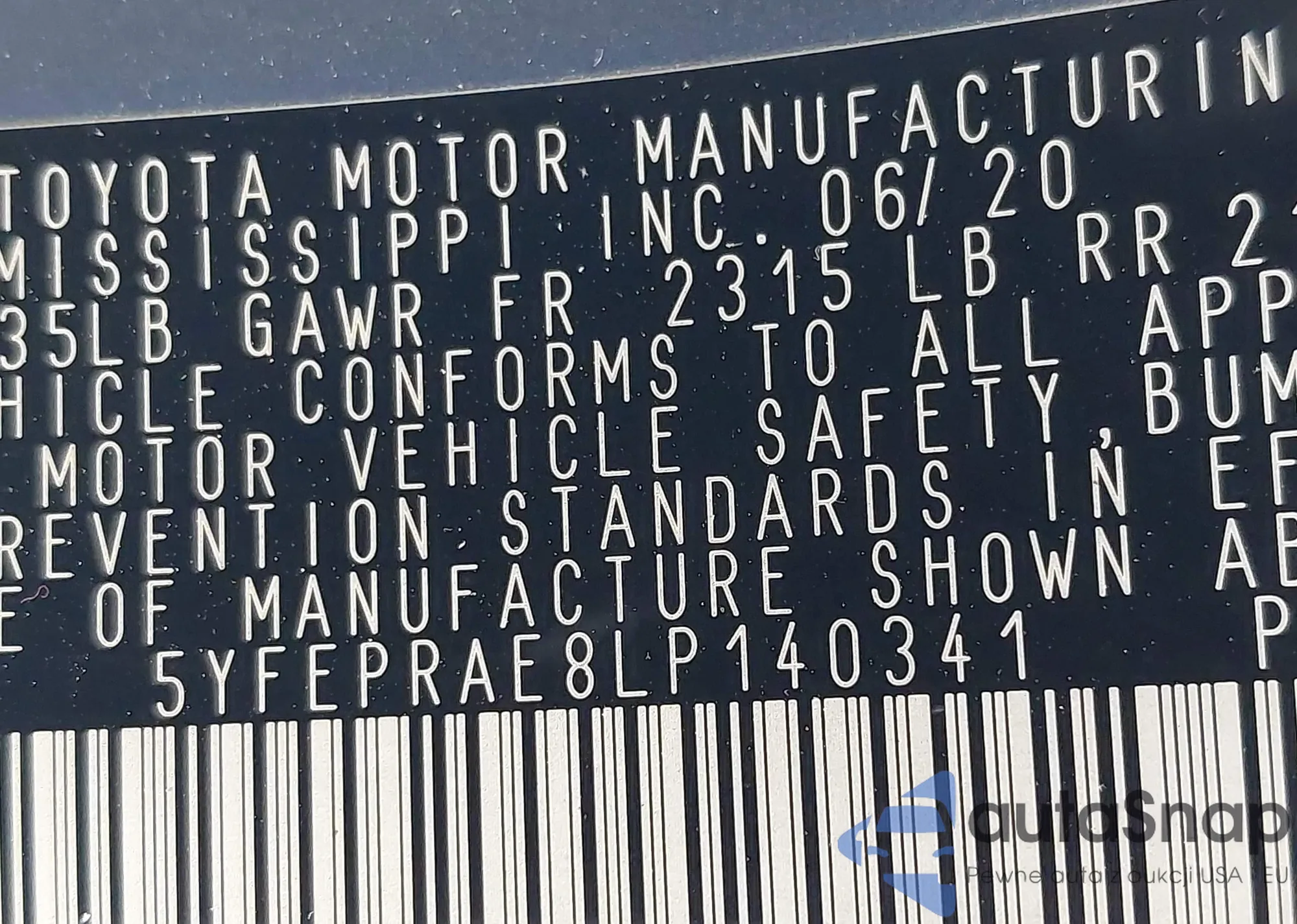 LOT: 42870581 VIN: 5YFEPRAE8LP140341