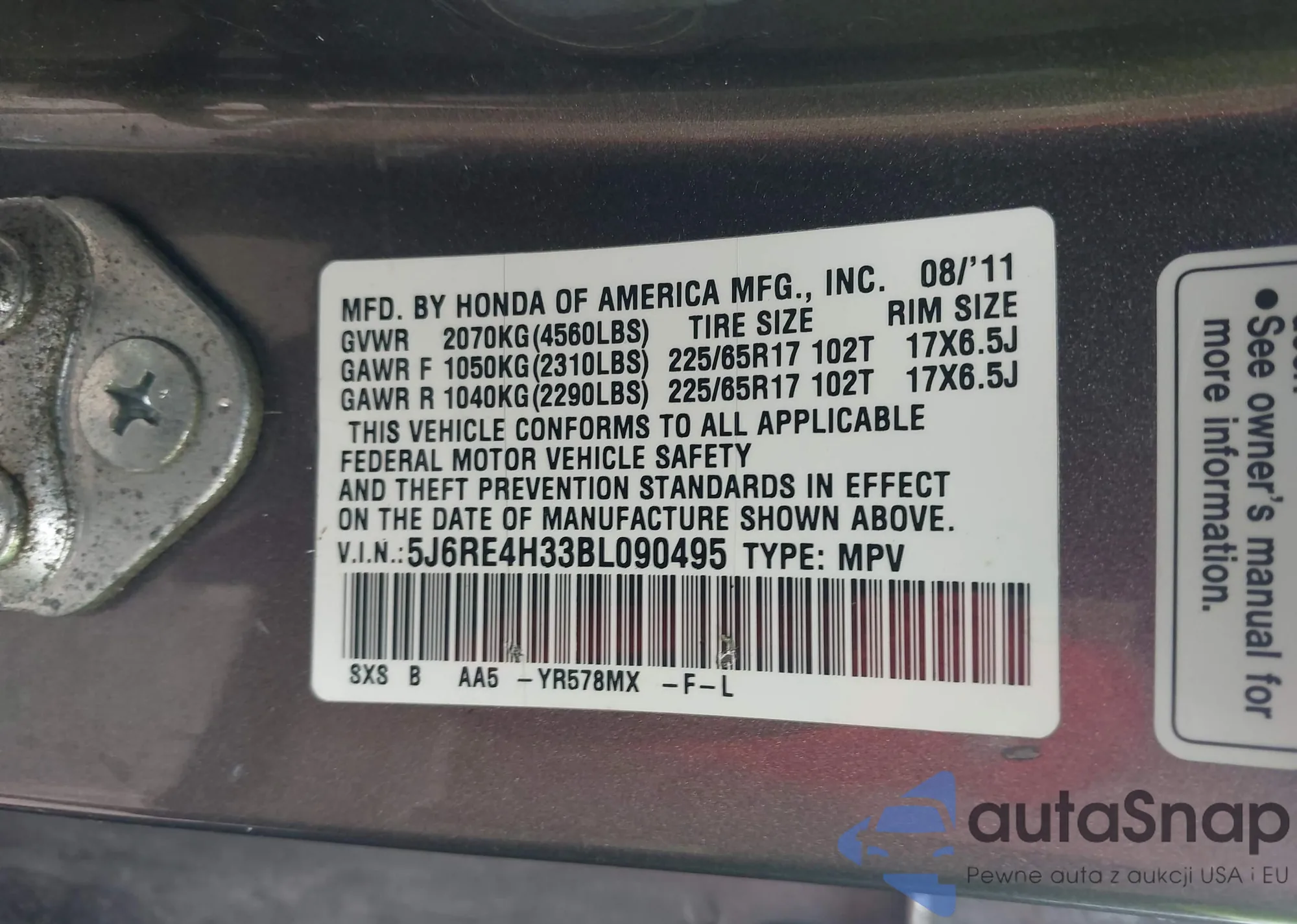 • VIN 5J6RE4H33BL090495