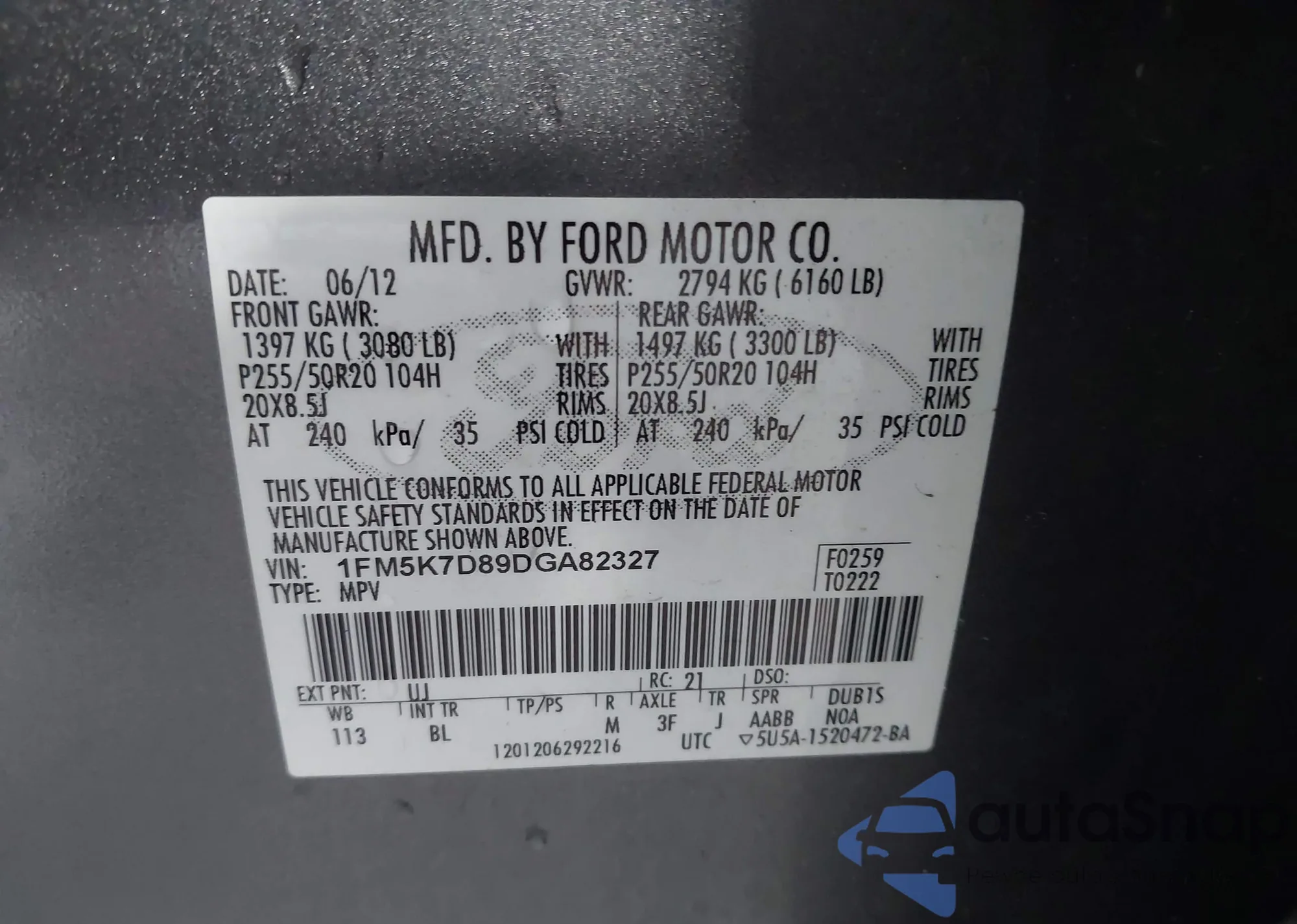 LOT: 42738648 VIN: 1FM5K7D89DGA82327