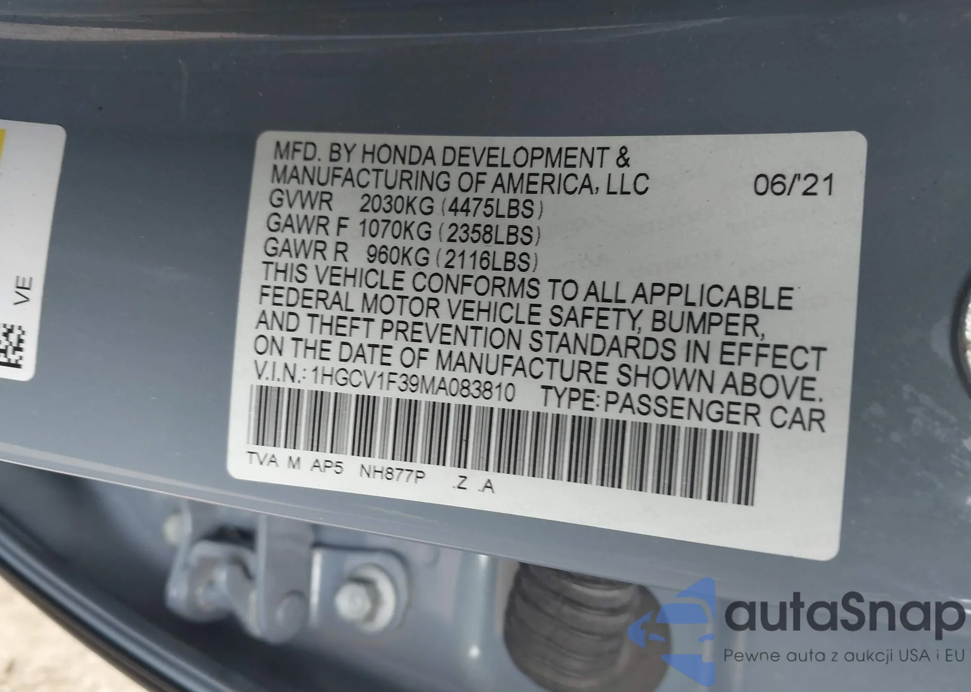 • VIN 1HGCV1F39MA083810