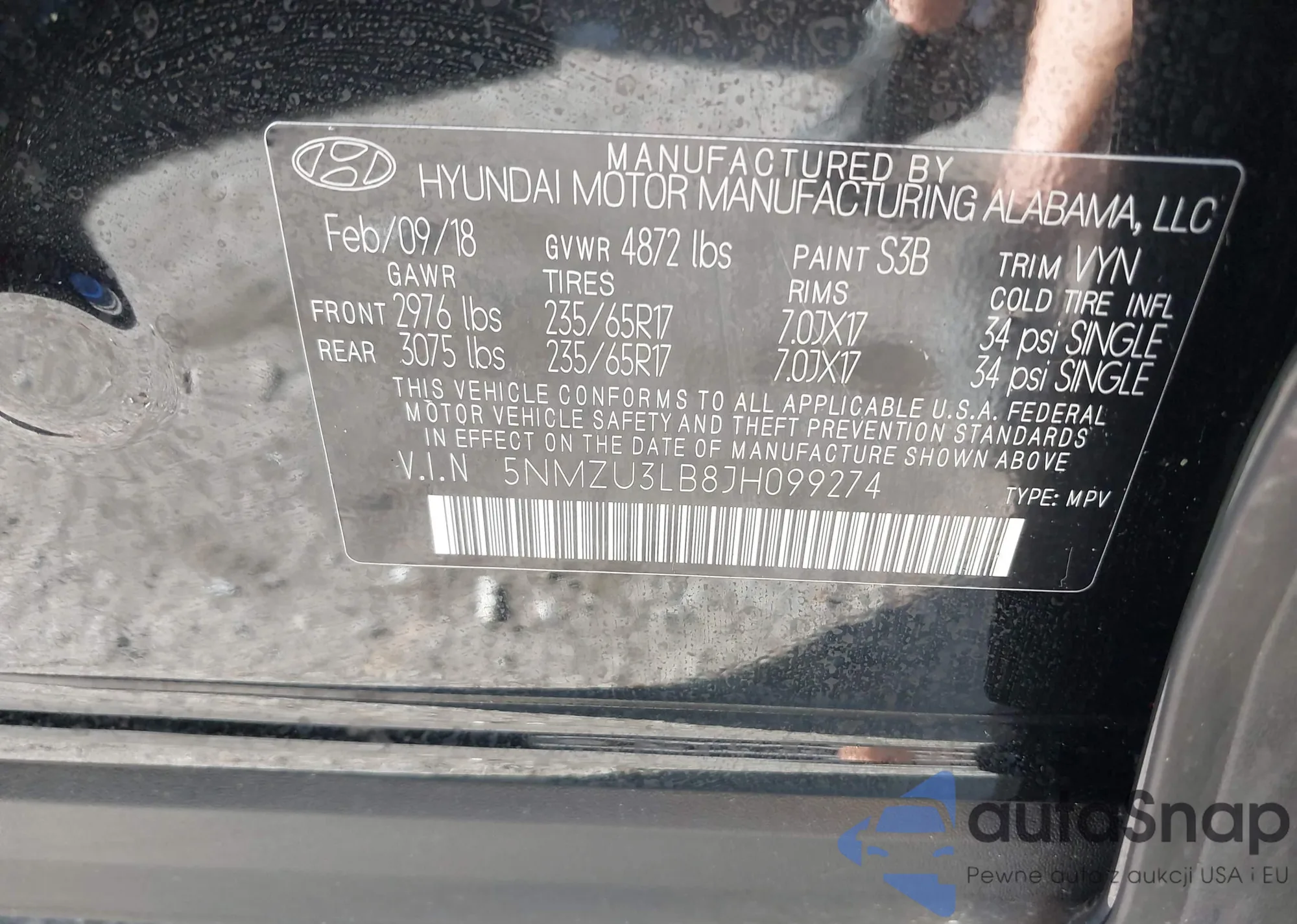 • VIN 5NMZU3LB8JH099274