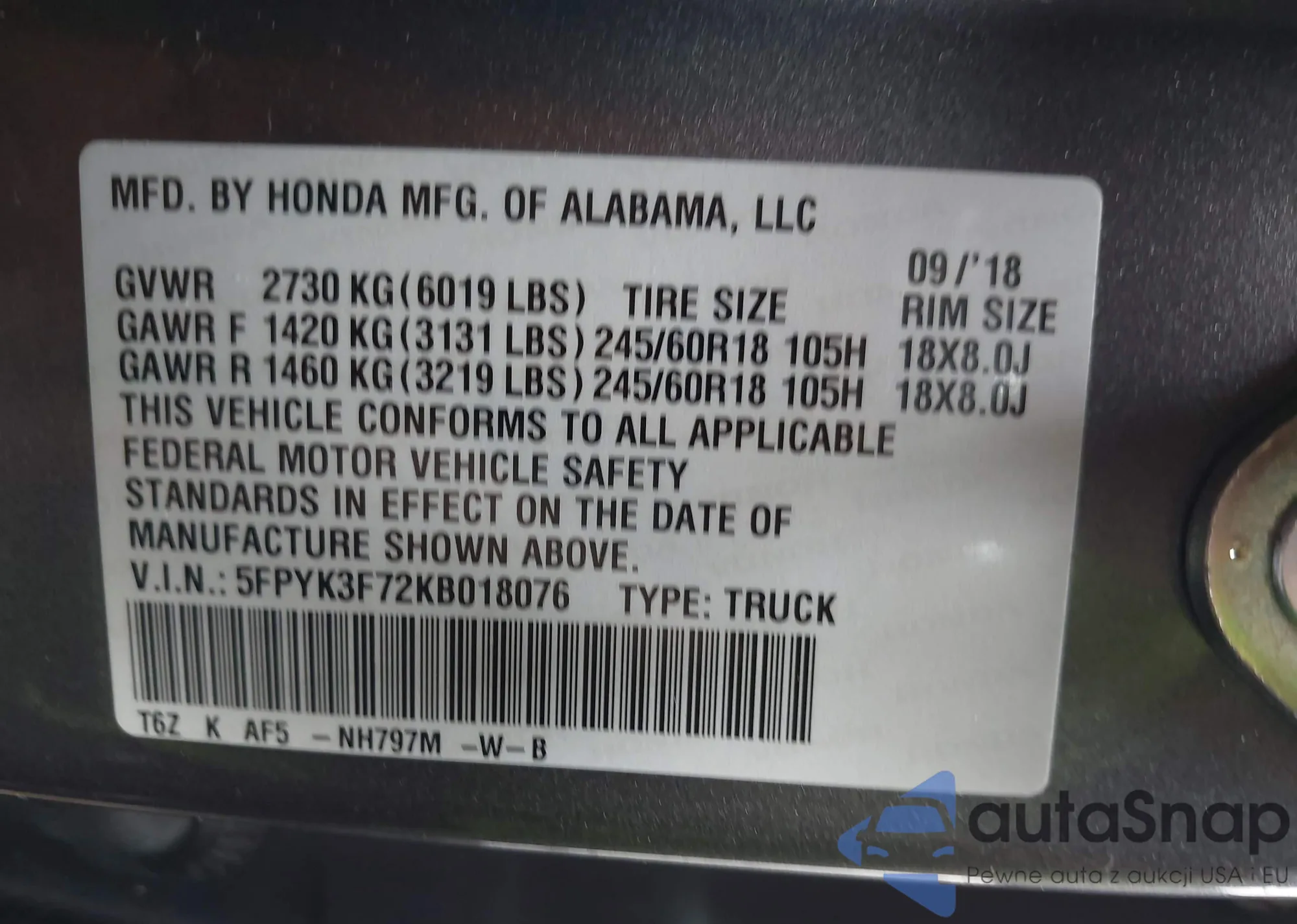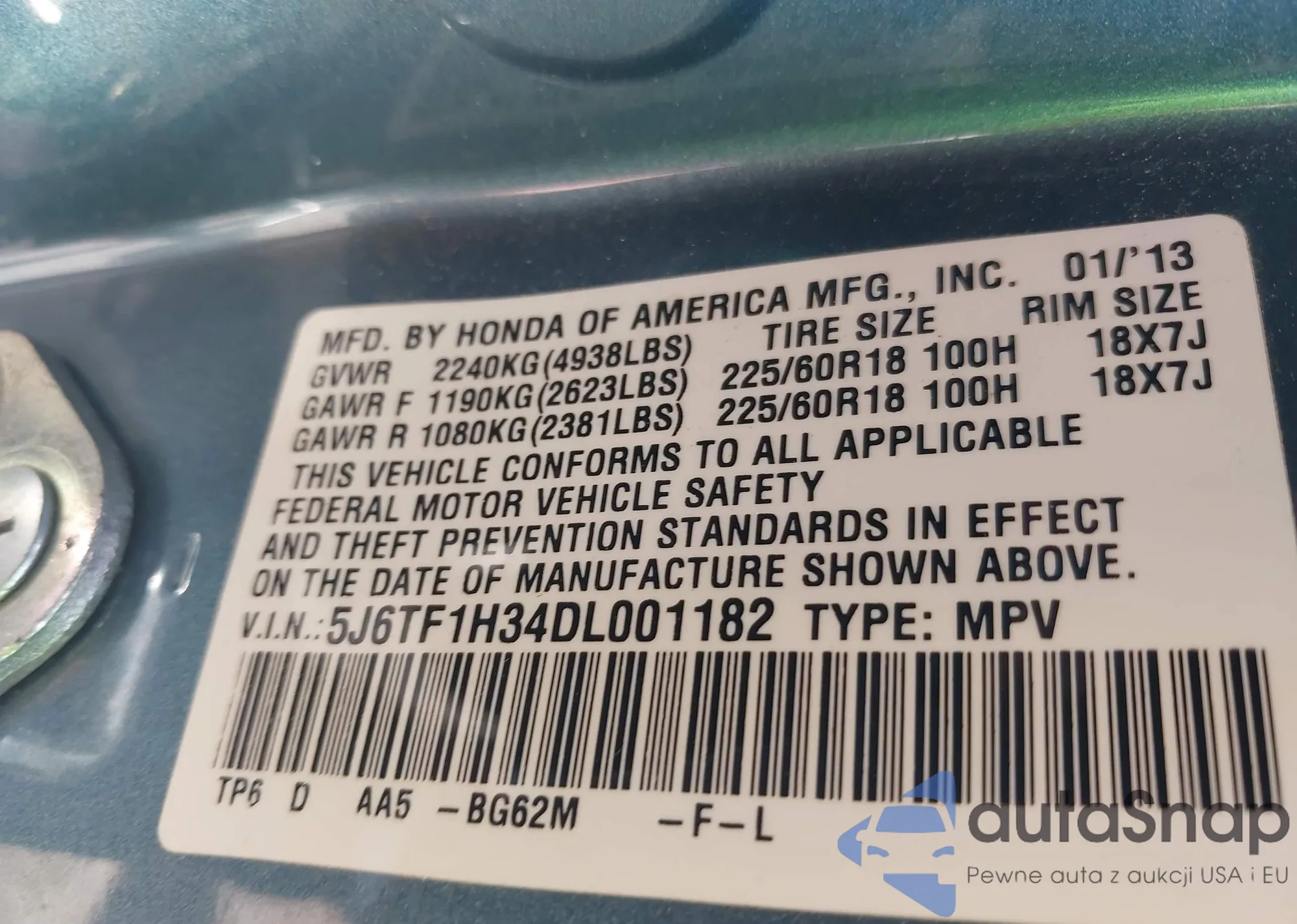 • VIN 2HKRW6H37JH233160