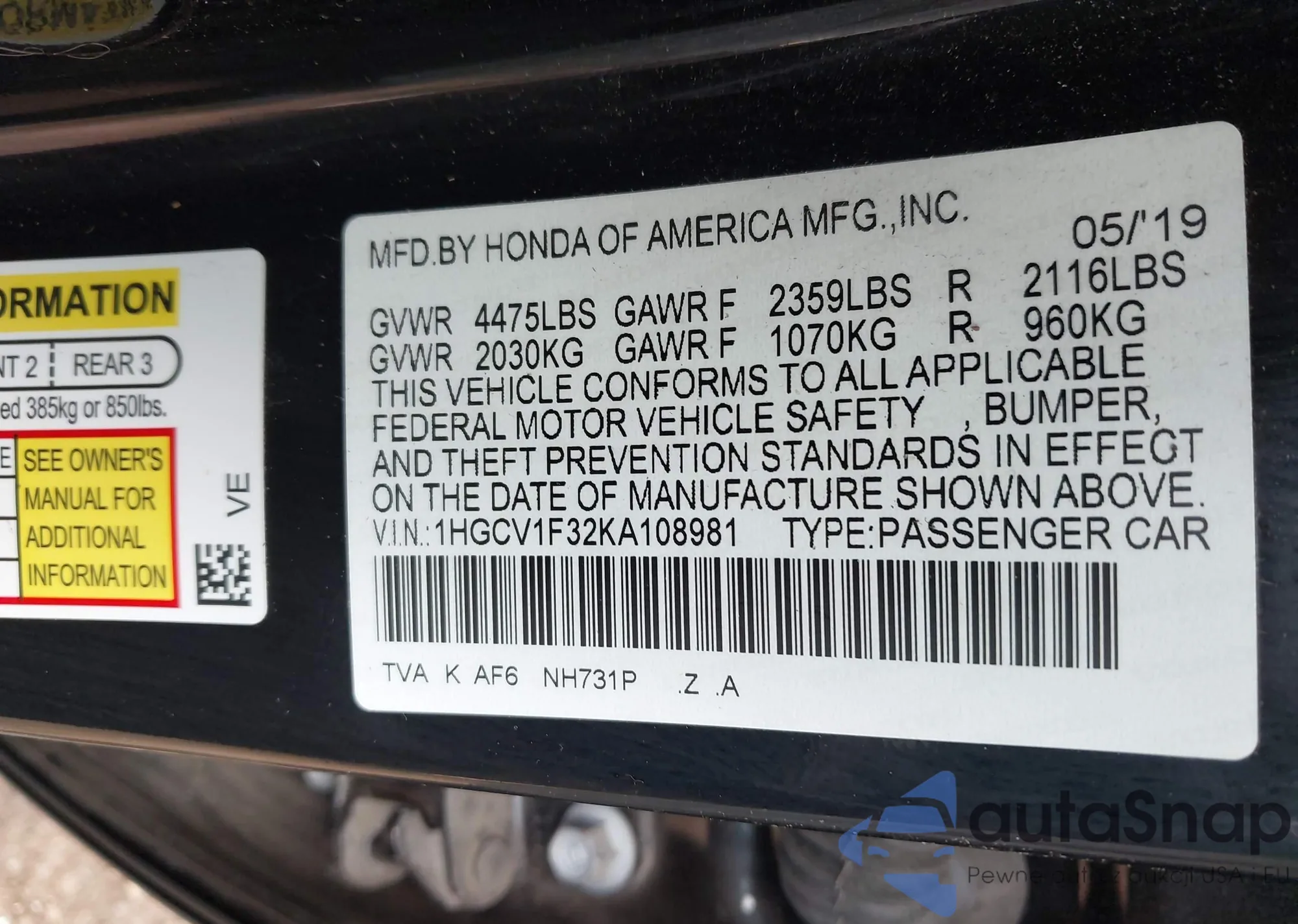 • VIN 1HGCV1F32KA108981
