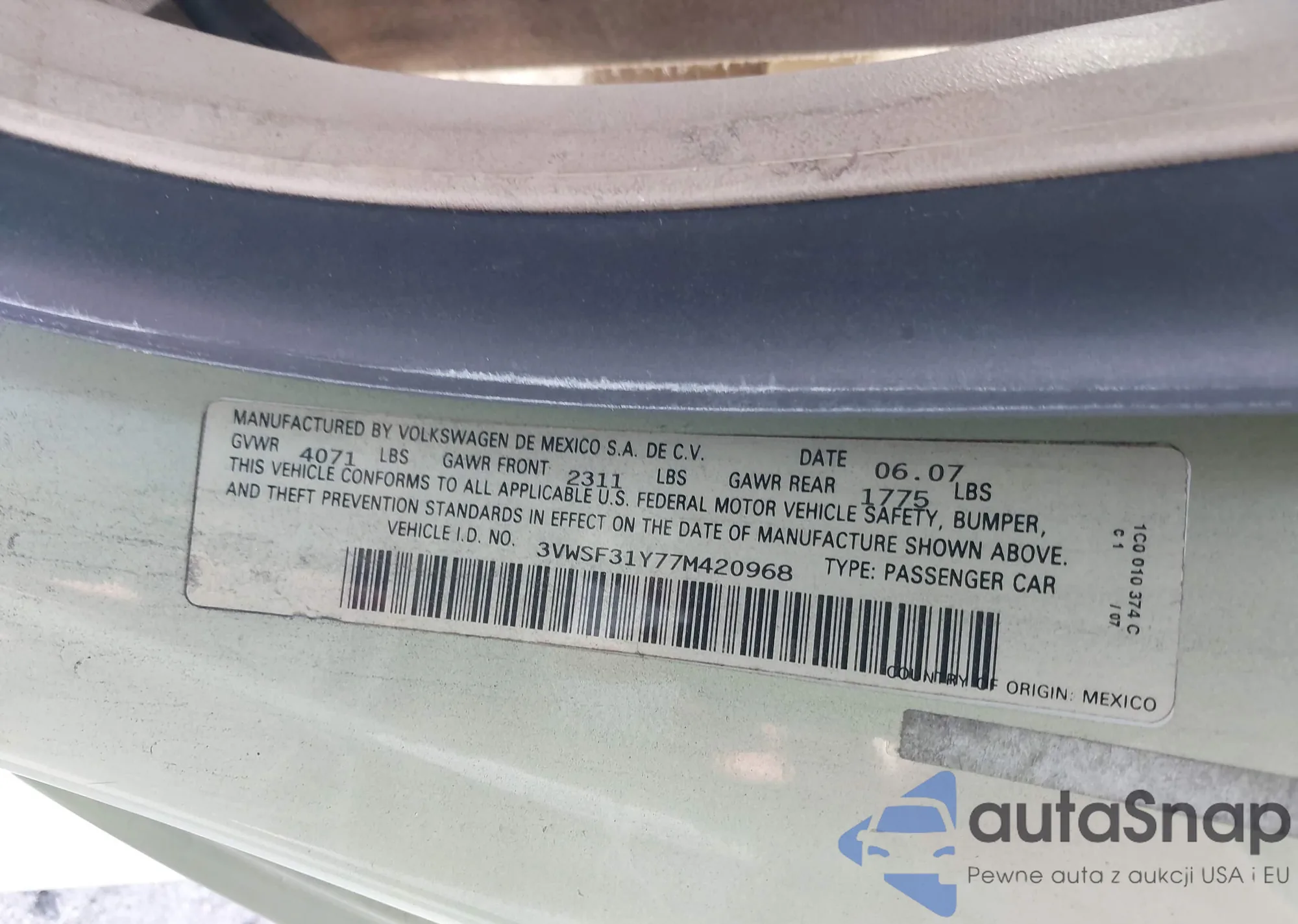 LOT: 42689738 VIN: 3VWSF31Y77M420968