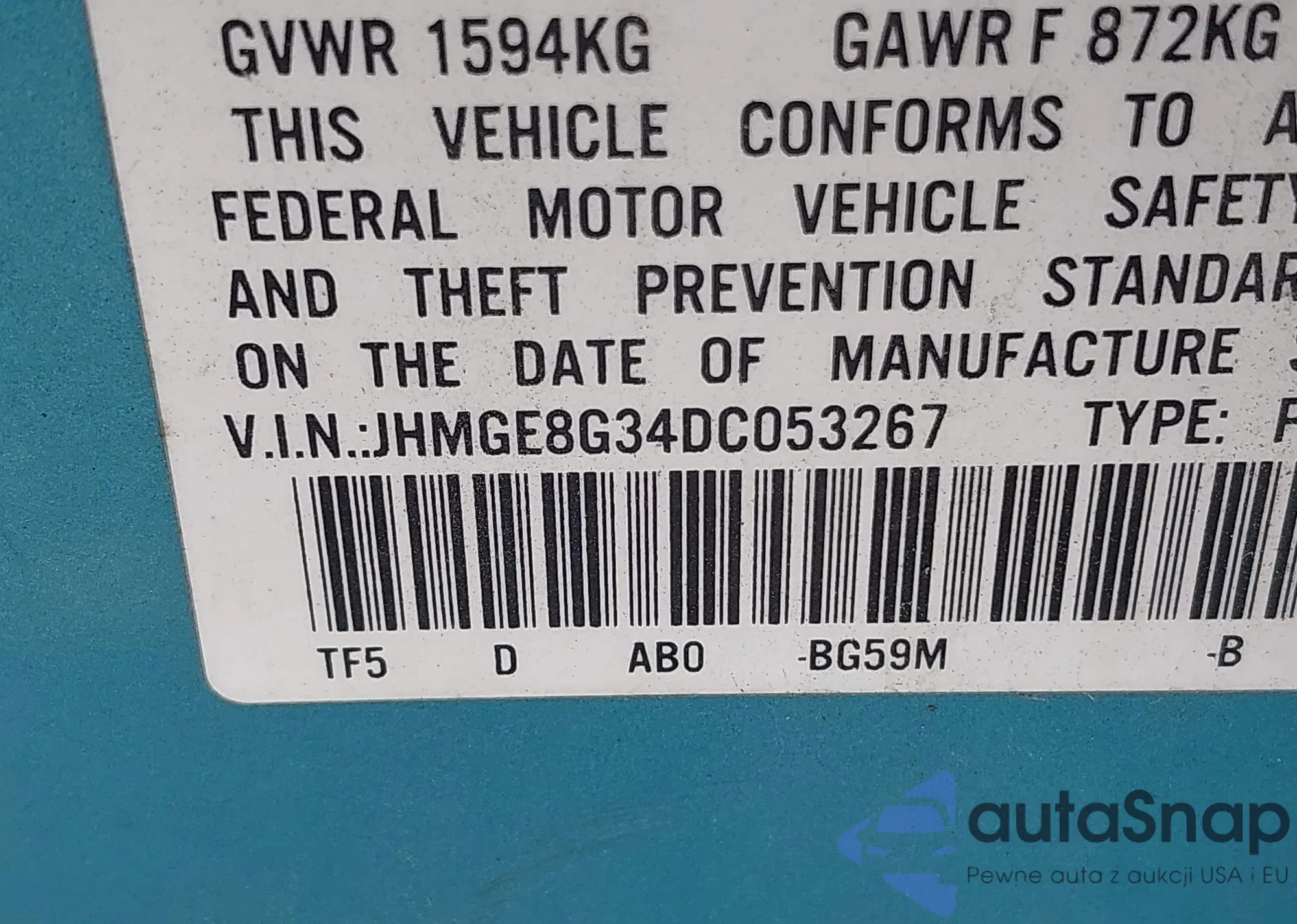 LOT: 42896666 VIN: JHMGE8G34DC053267
