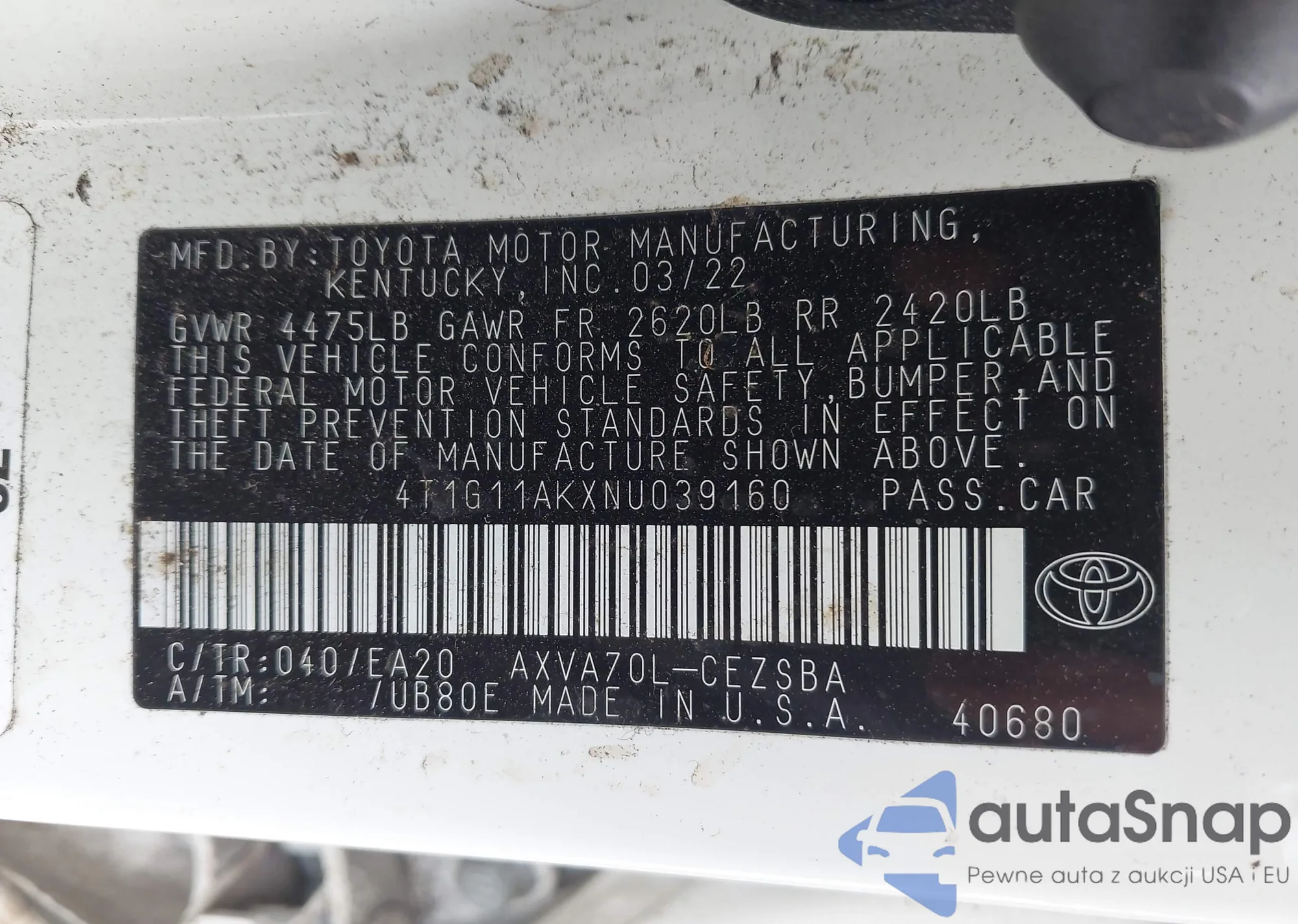 • VIN 4T1G11AKXNU039160