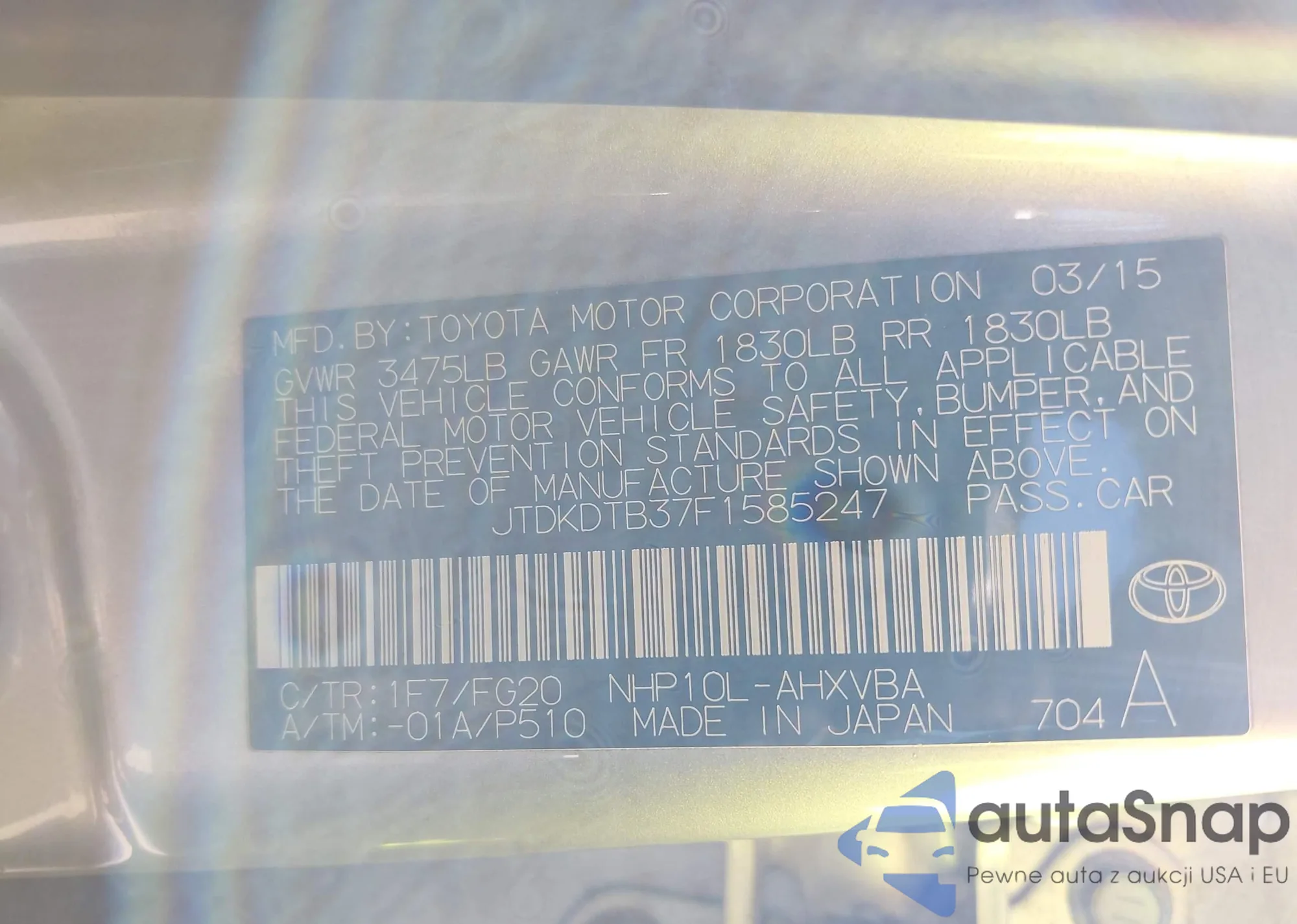 LOT: 42957379 VIN: JTDKDTB37F1585247