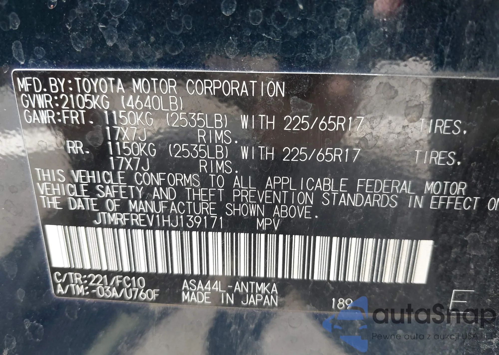 LOT: 42521824 VIN: JTMRFREV1HJ139171