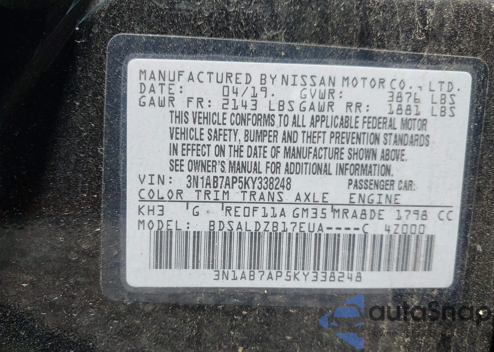 • VIN 3N1AB7AP5KY338248