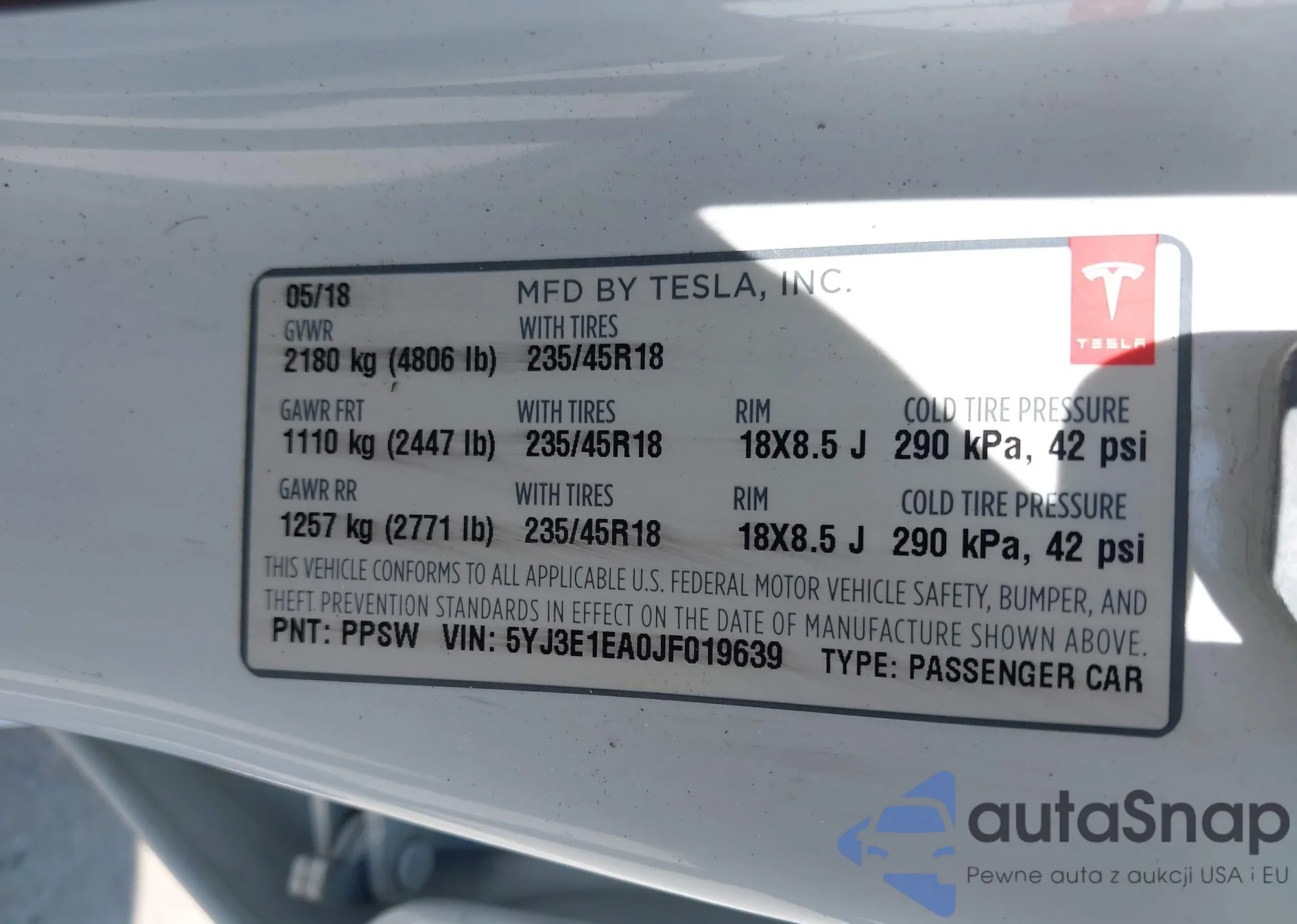 LOT: 42718226 VIN: 5YJ3E1EA0JF019639