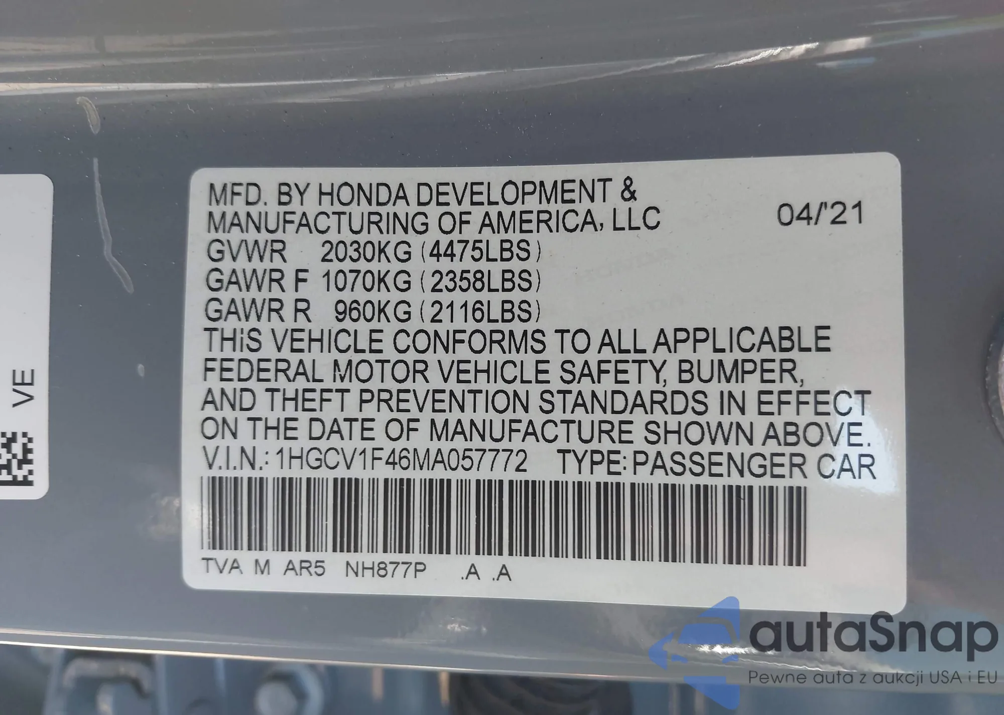 LOT: 42580811 VIN: 1HGCV1F46MA057772