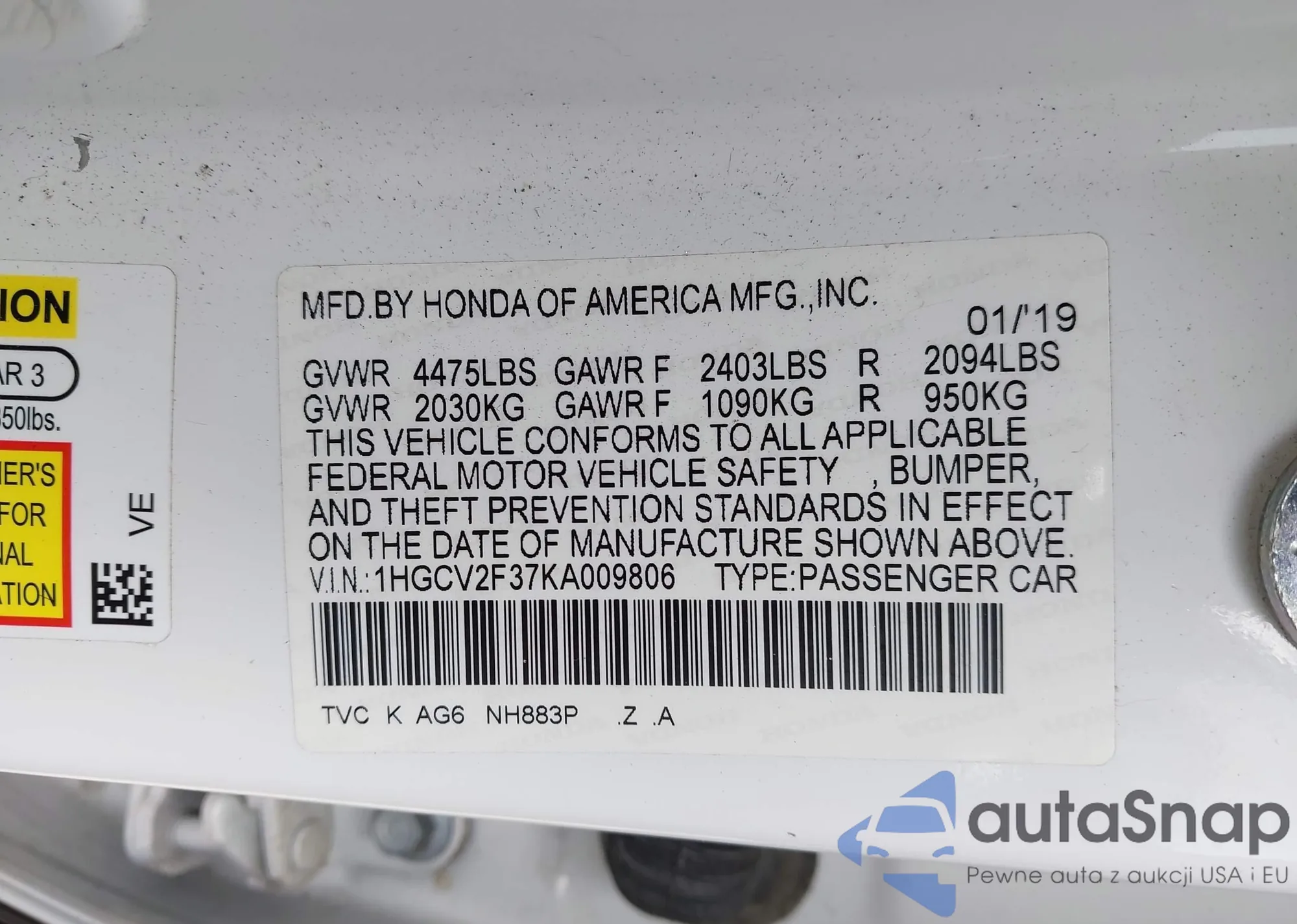 • VIN 1HGCV2F37KA009806