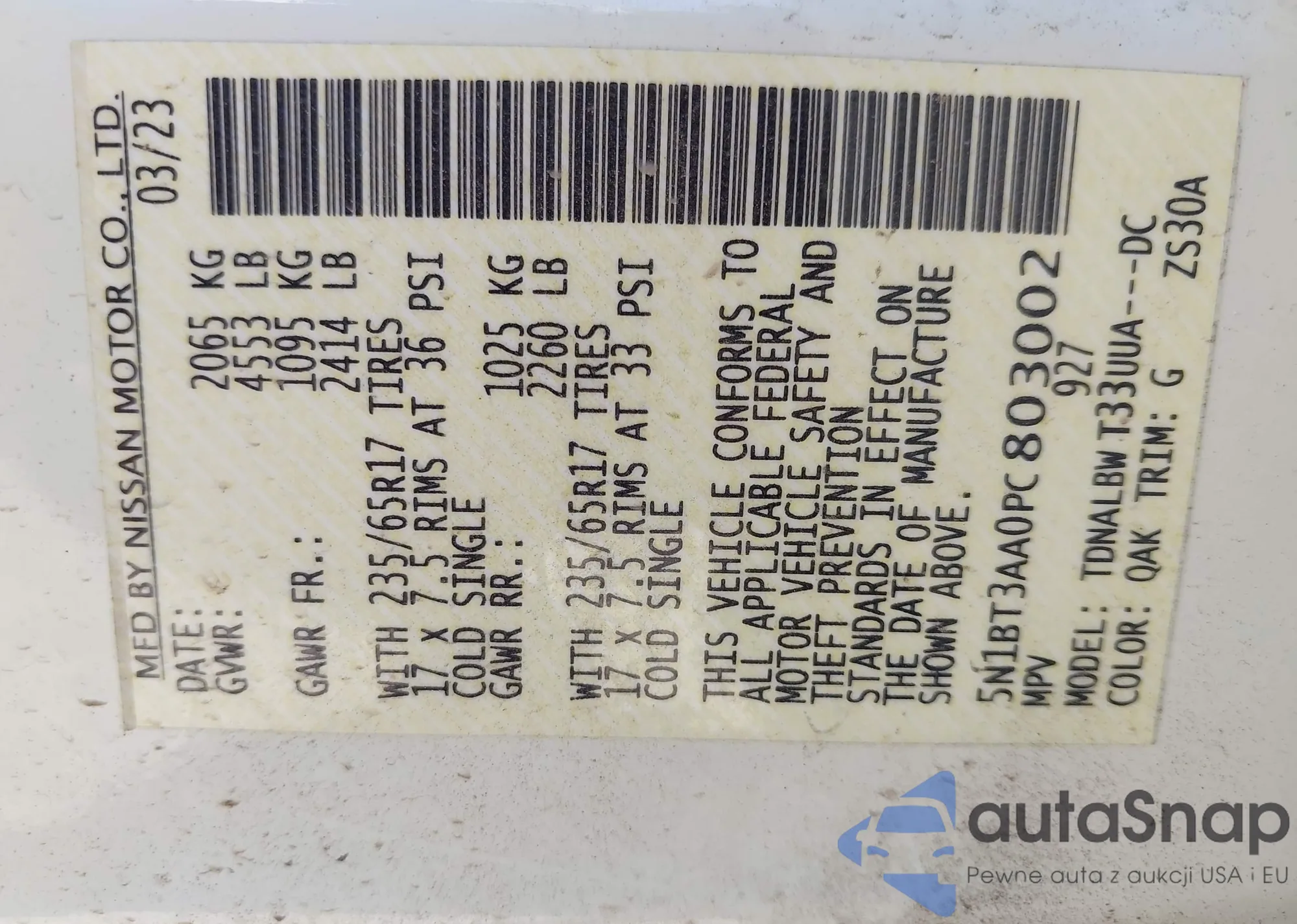 LOT: 42984591 VIN: 5N1BT3AA0PC803002