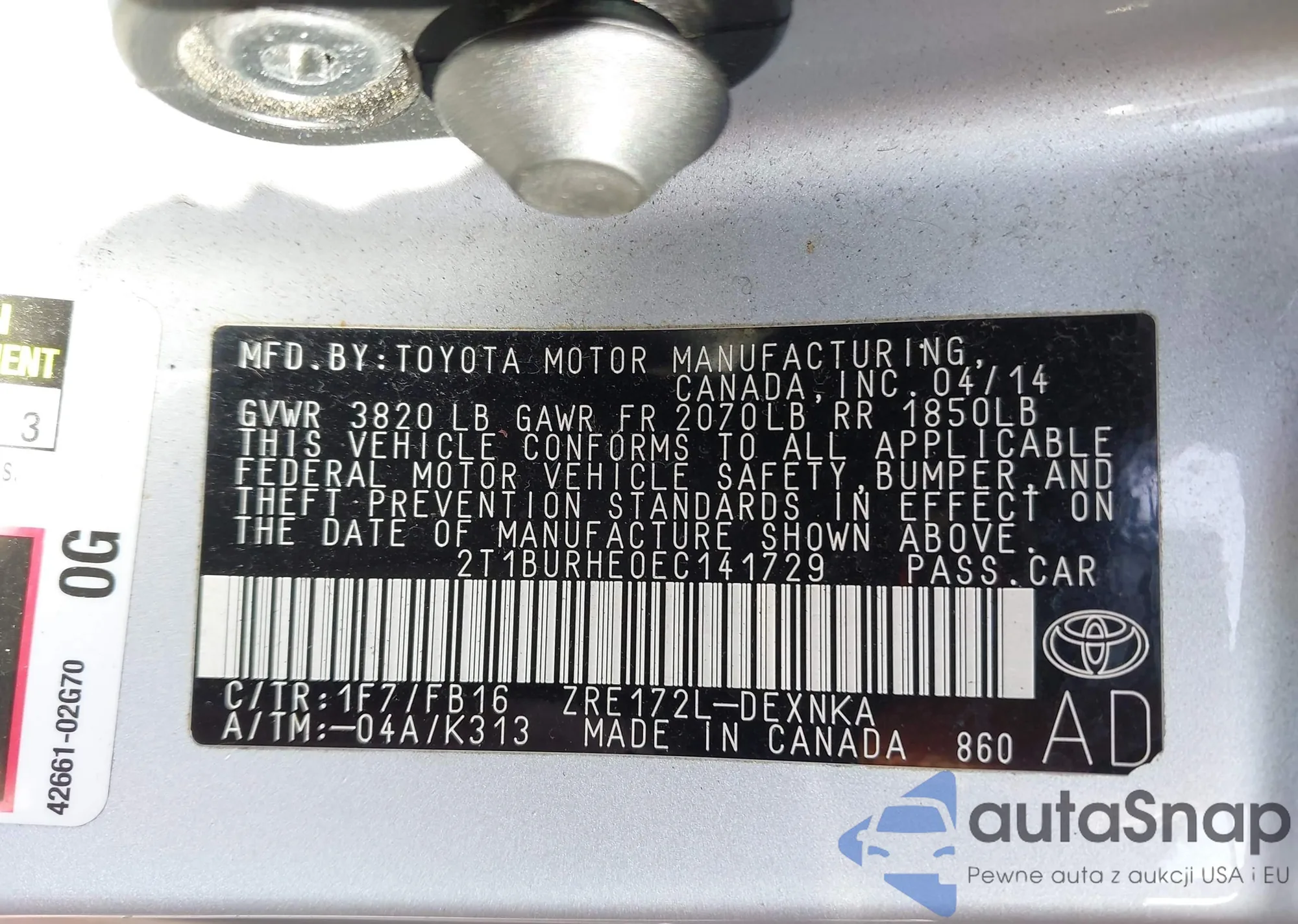 LOT: 42946947 VIN: 2T1BURHE0EC141729
