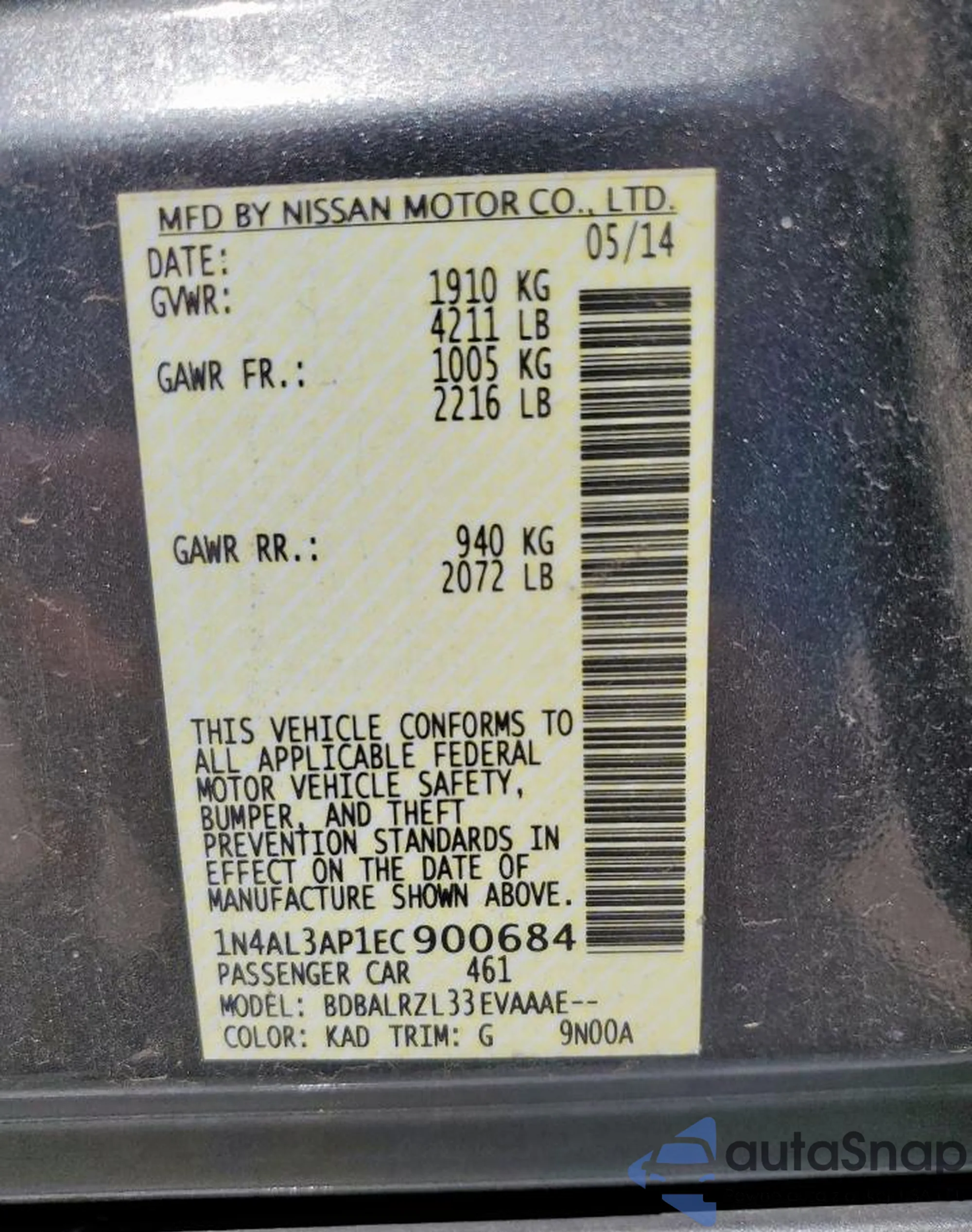 • VIN 1N4AL3AP1EC900684
