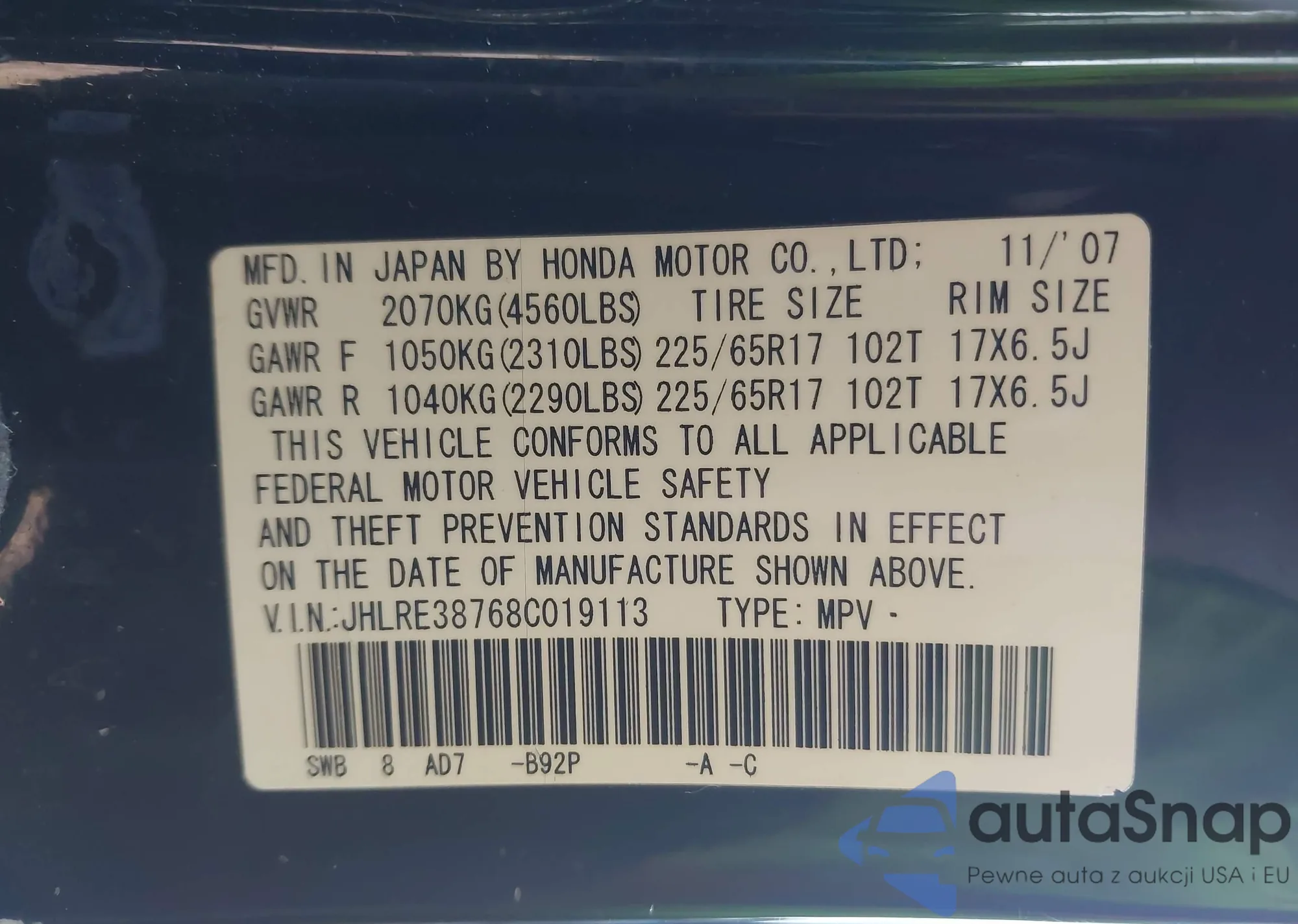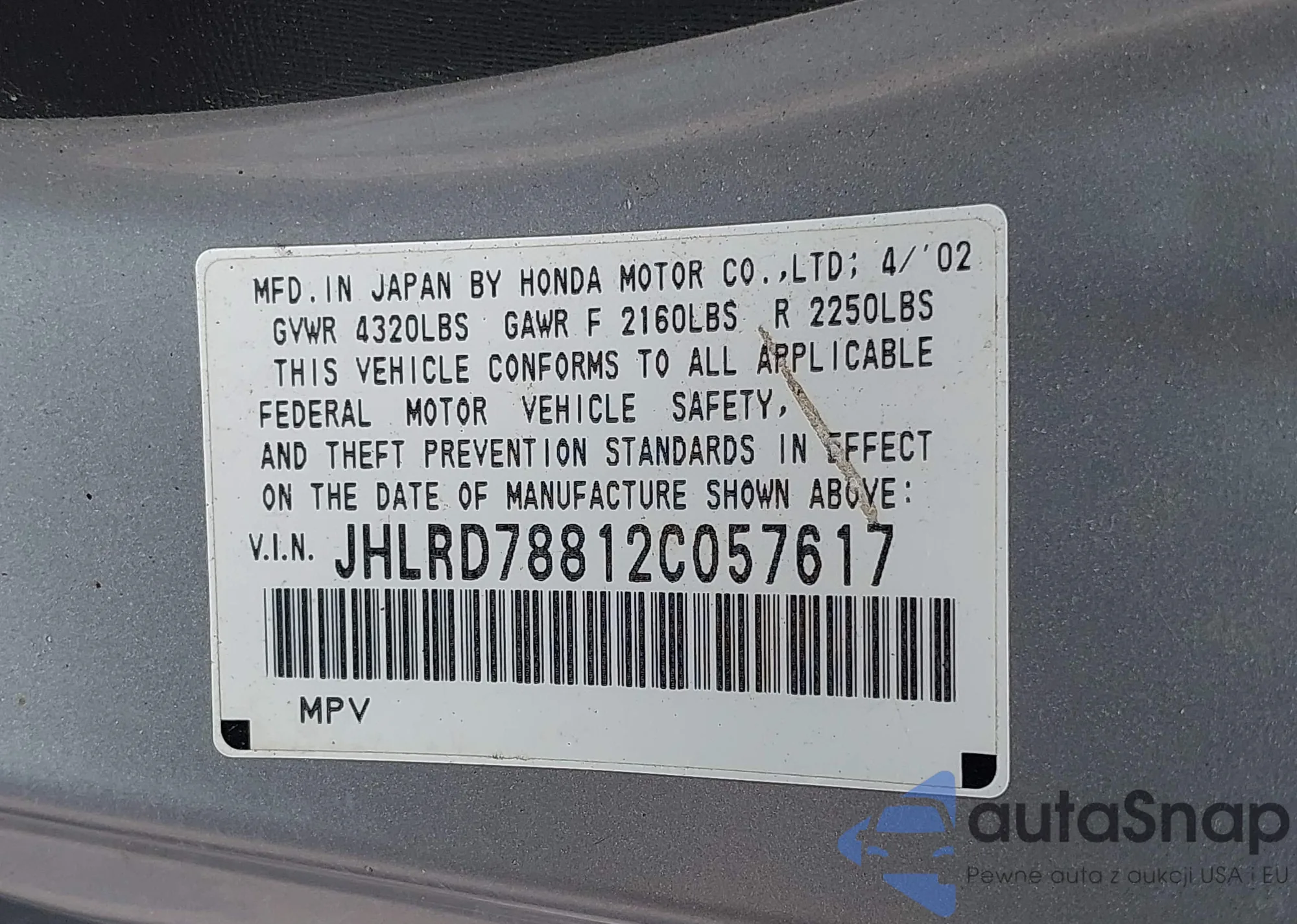 • VIN JHLRD78812C057617