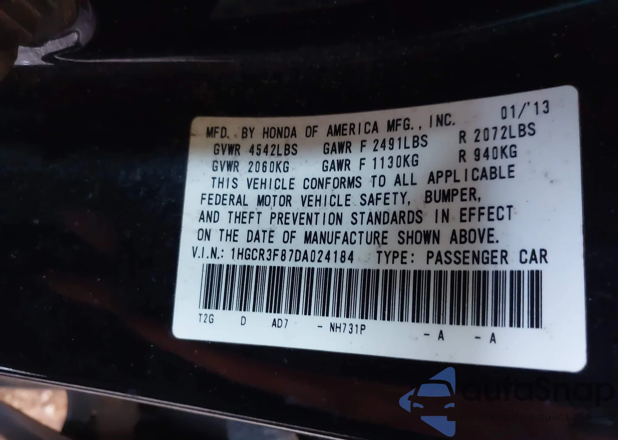 LOT: 42718709 VIN: 1HGCR3F87DA024184