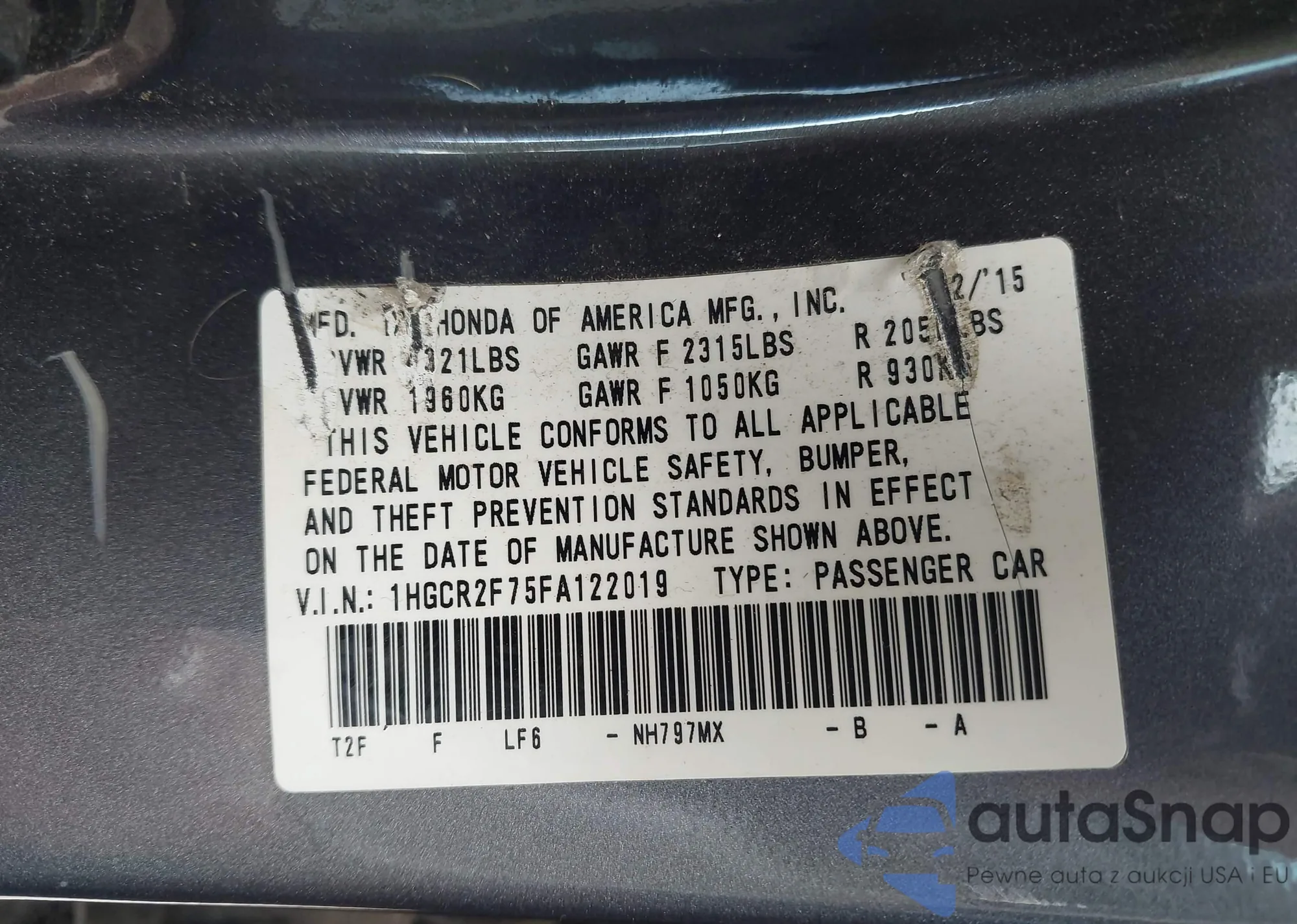 LOT: 42752664 VIN: 1HGCR2F75FA122019