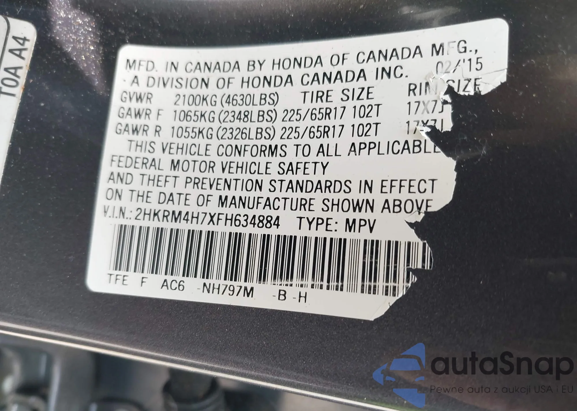 • VIN 2HKRM4H7XFH634884