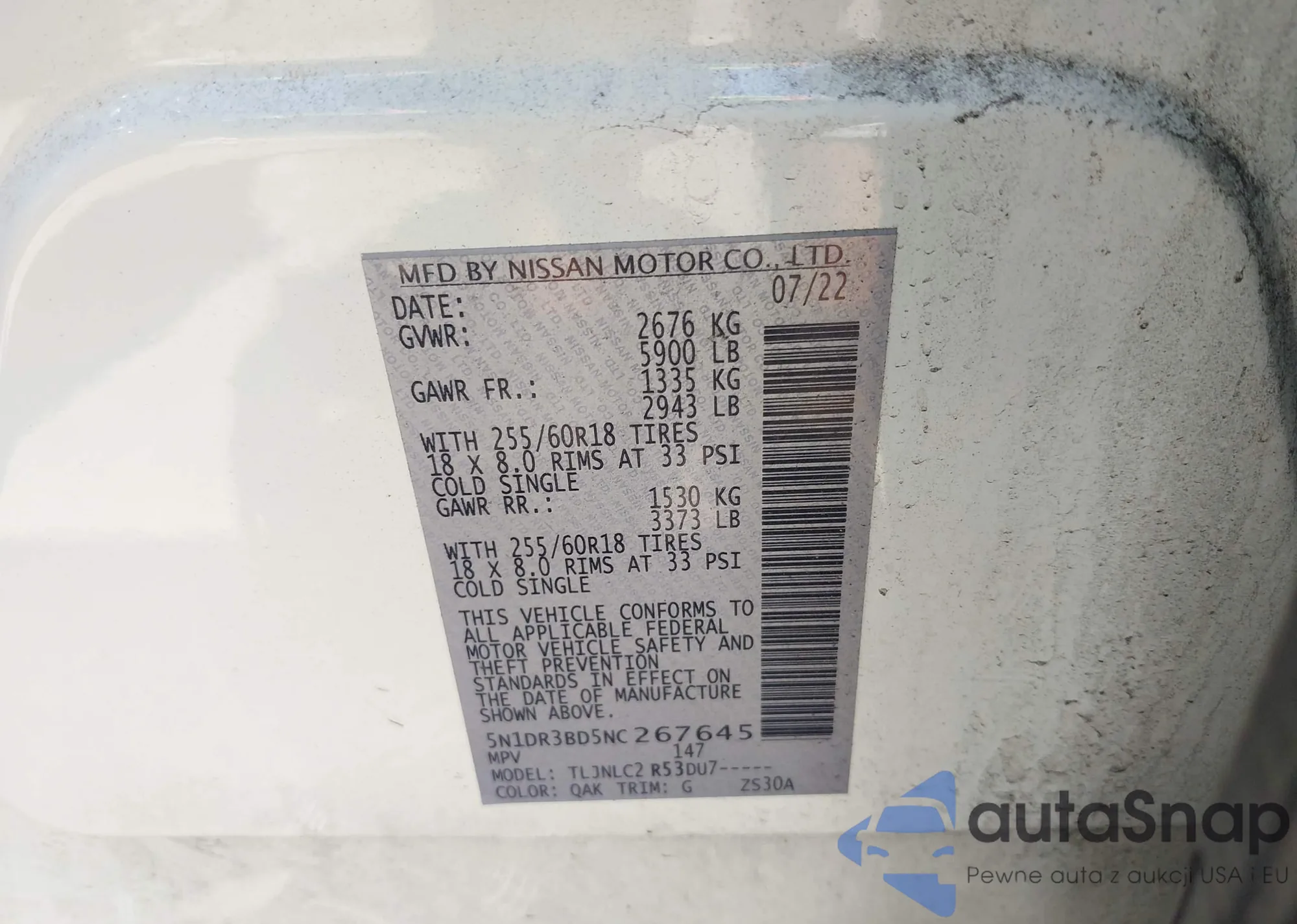 • VIN 5N1DR3BD5NC267645
