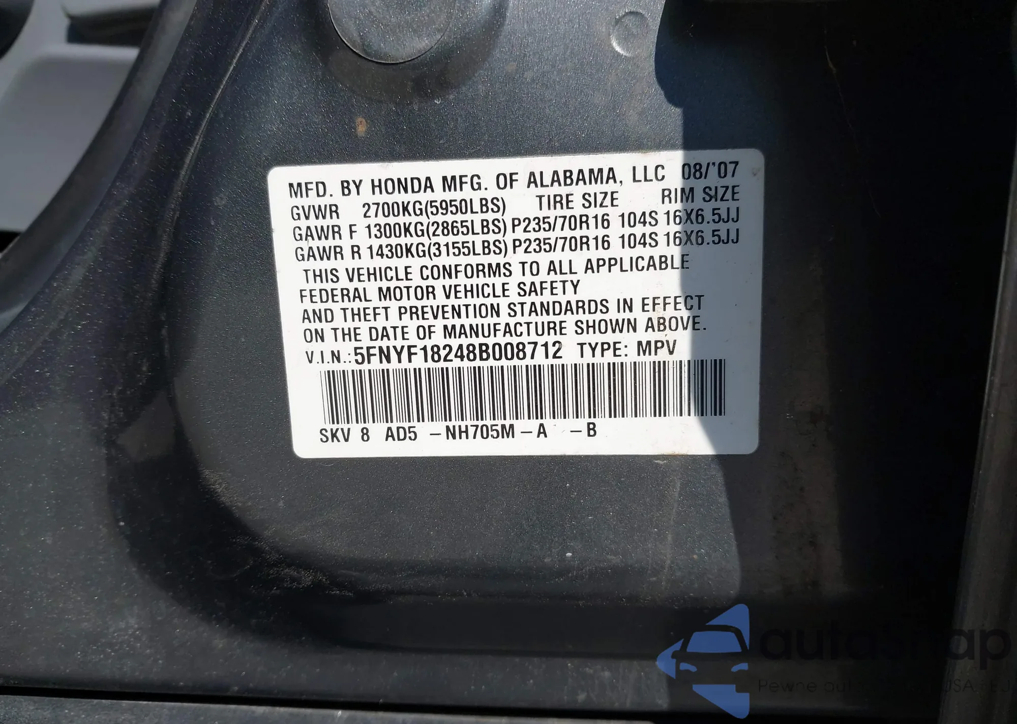 • VIN 5FNYF18248B008712