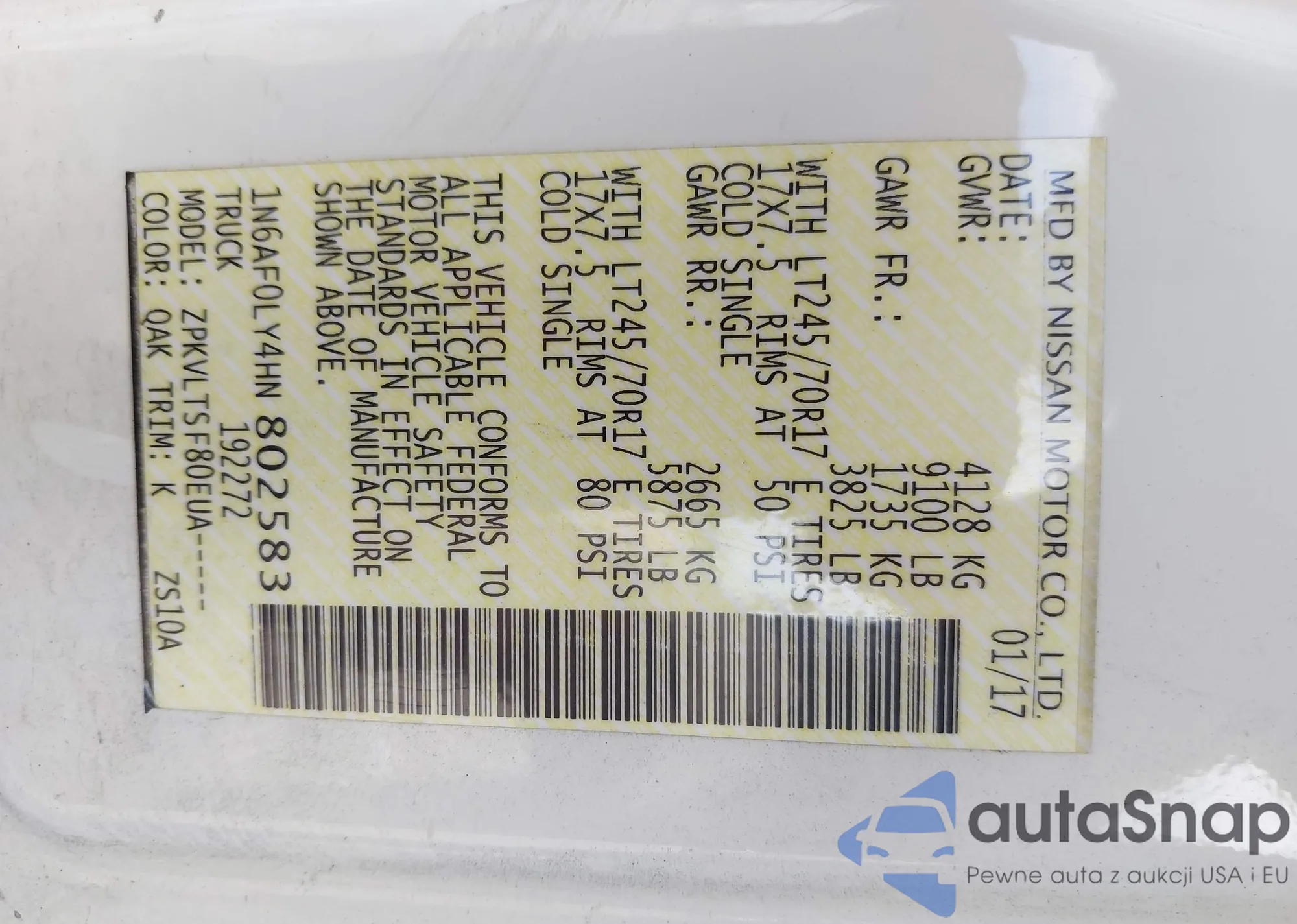 LOT: 42952899 VIN: 1N6AF0LY4HN802583
