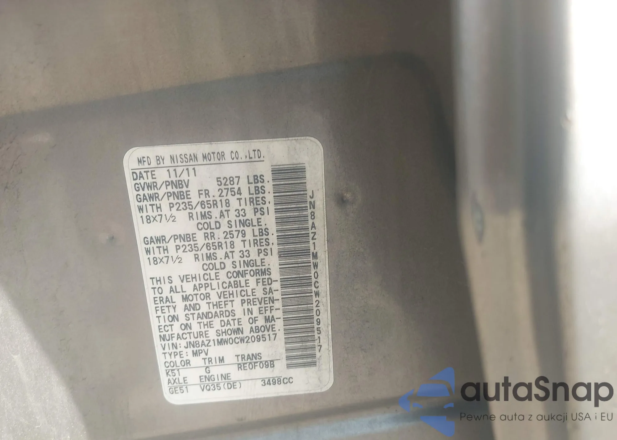 • VIN JN8AZ1MW0CW209517