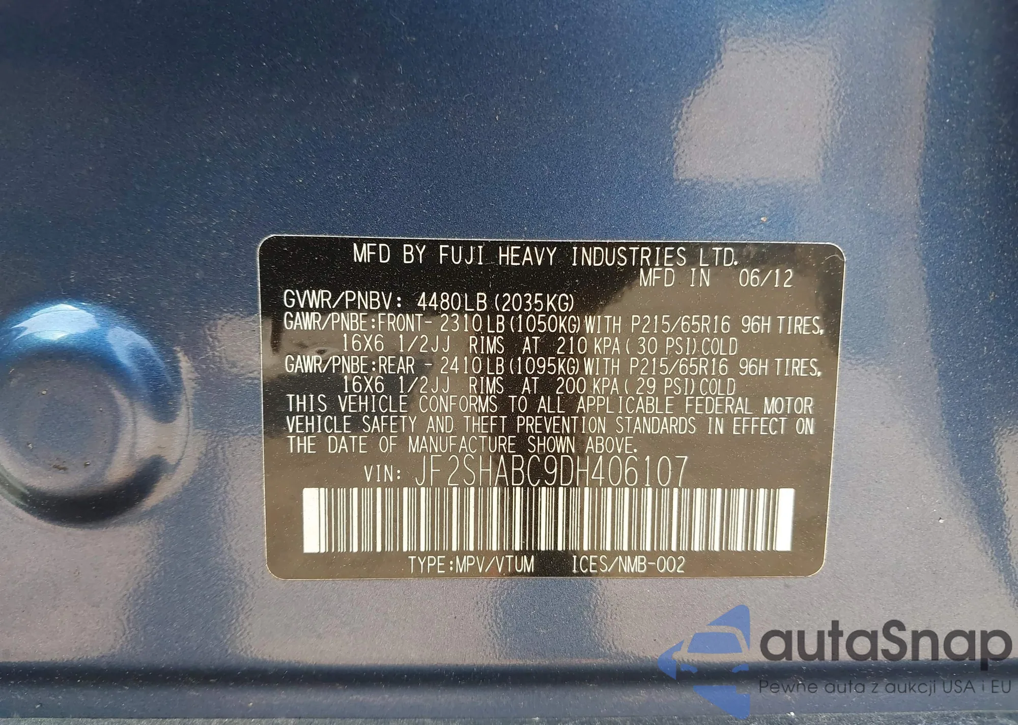 LOT: 42935821 VIN: JF2SHABC9DH406107