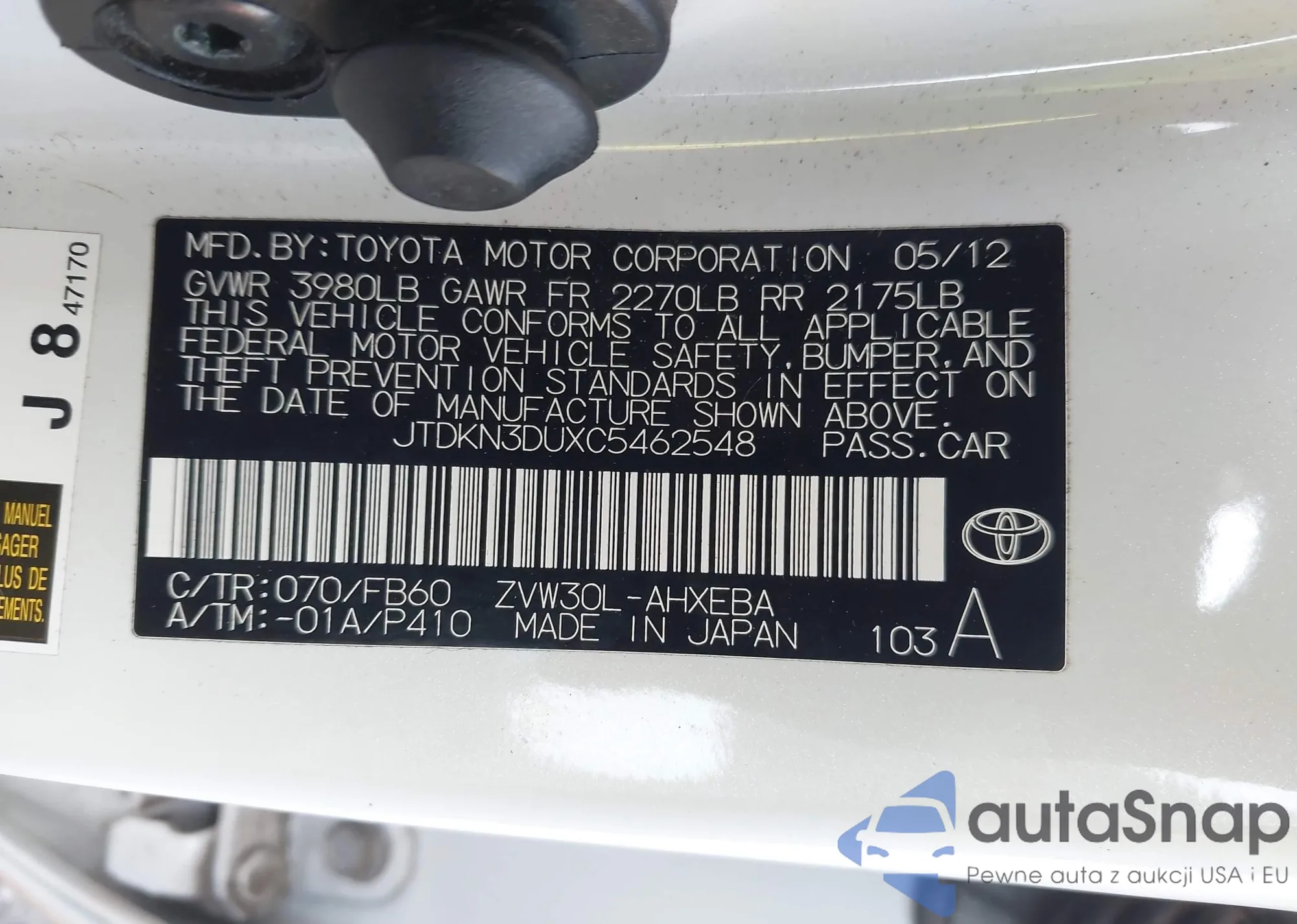 LOT: 43010614 VIN: JTDKN3DUXC5462548